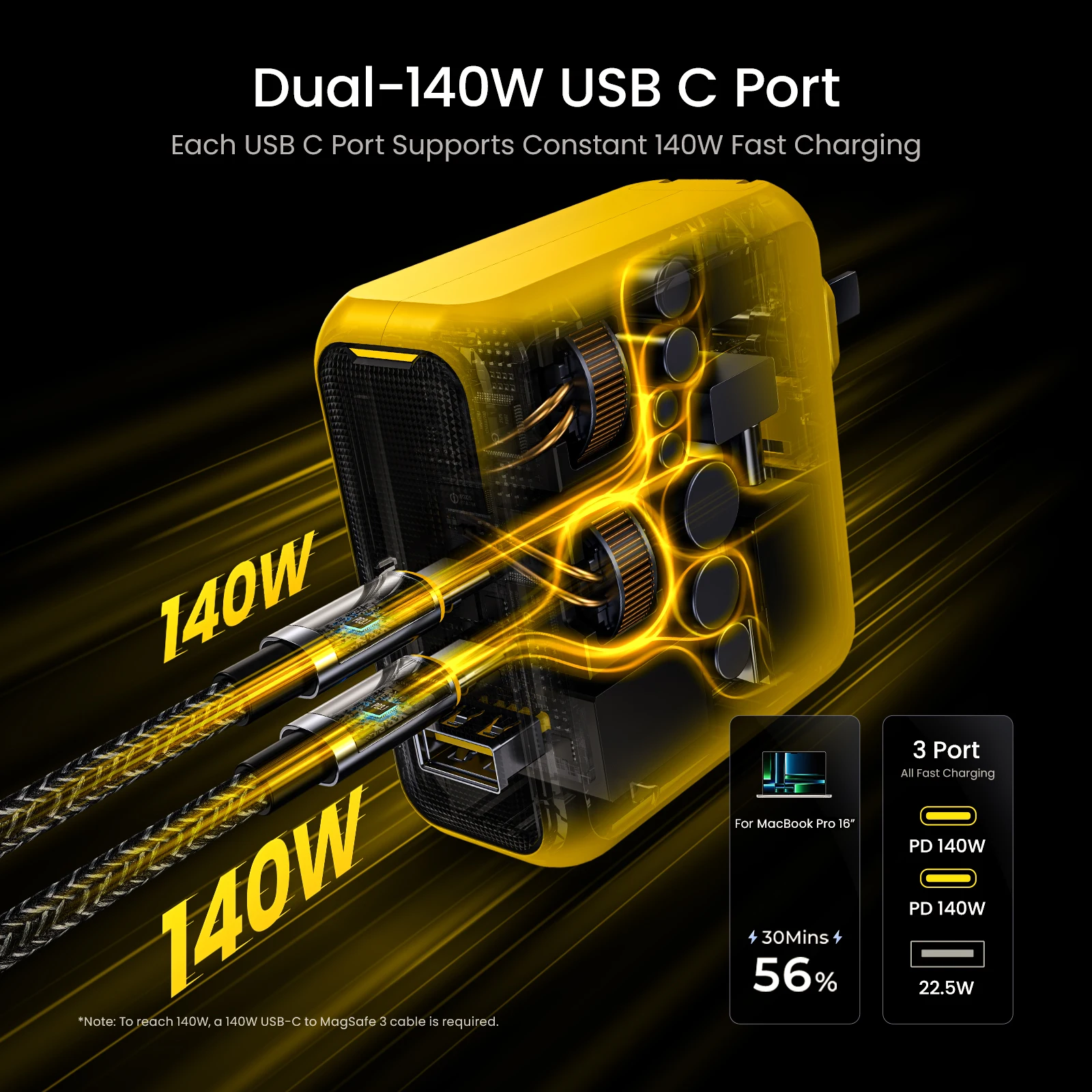 The AOHI Magcube Dual-140W PD3.1 USB-C charger is the first to maintain a 140W output, ensuring your device stays in a stable and constant fast-charging state. This 140W Magcube PD 3.1 GaN+ laptop charger utilizes a PFC+AHB asymmetric half-bridge structure to maintain stable output voltage during charging. Both USB-C ports can support 140W fast charging for the MacBook Pro 16″ (must be used with a USB-C to MagSafe 3 charging cable, not included). It’s a true game changer, delivering the most reliable 140W charging solution in the industry
