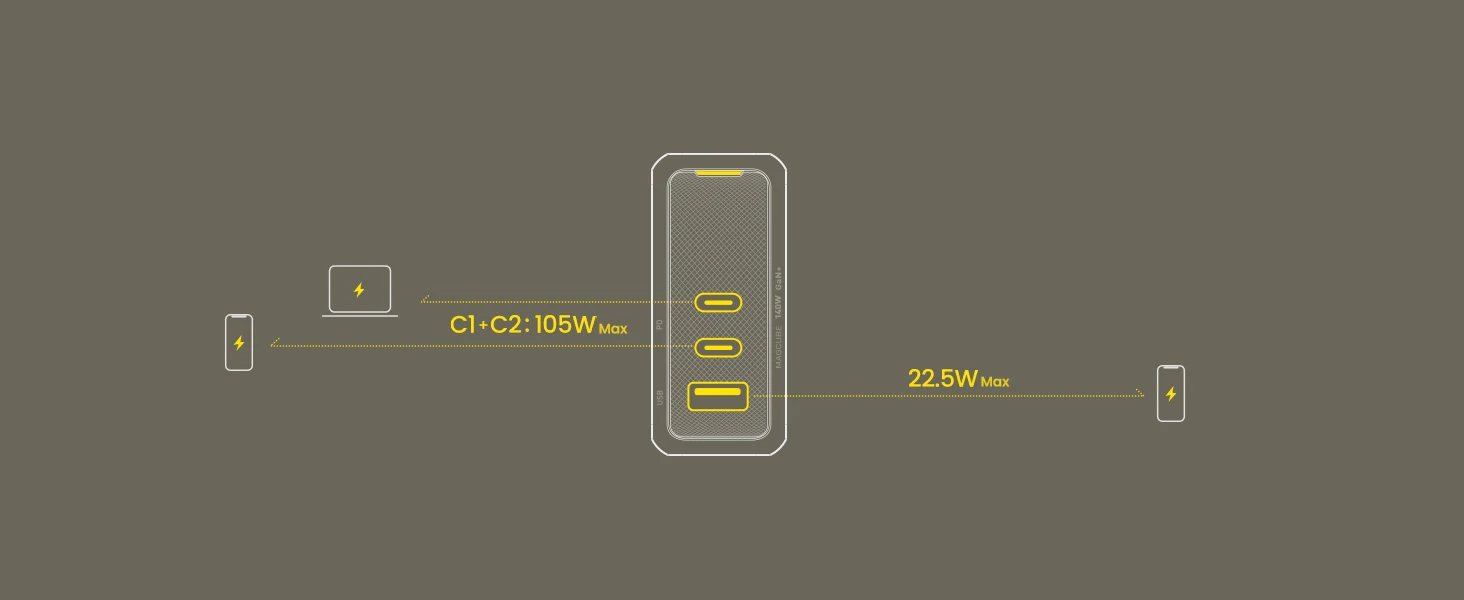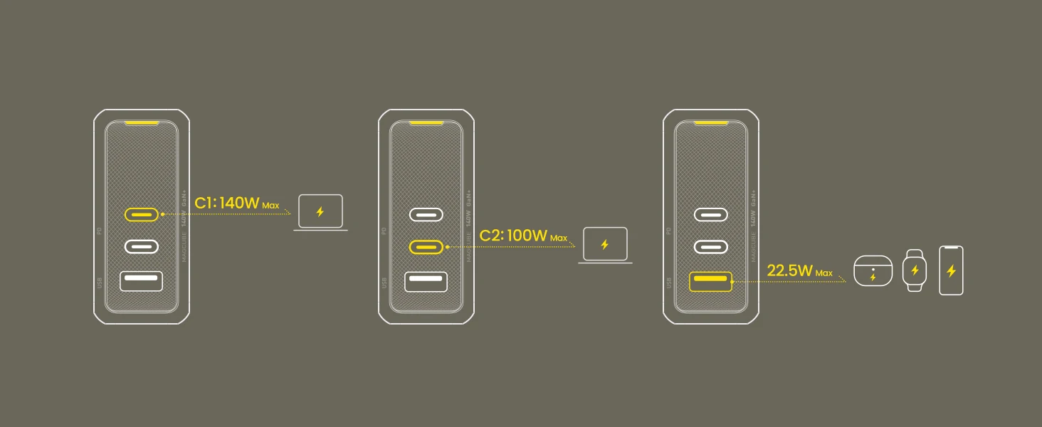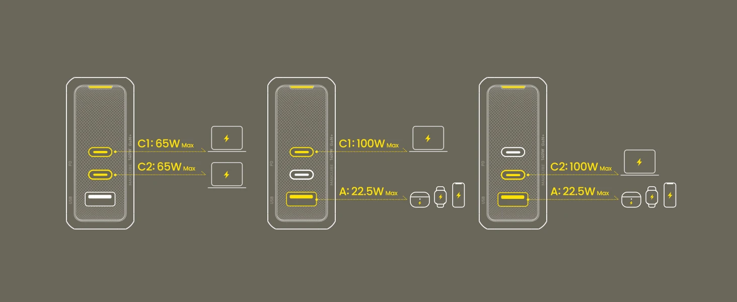 Two USB C ports and one USB A port power two 14 inch laptops and a phone simultaneously, fast enough for a multi device tech user. If charge two laptops at the same time, both usb c port can reach 65W output. What’s more is that this 3-port usb c power adapter can help you to keepping your desktop tidy
