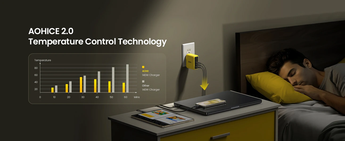 Equipped with AOHi-ICE 2.0 technology, AOHi Youth 140W fast charger has passed 1,070,000 full power overload tests, supports high power output while real-time temperature control and rapid heat dissipation, safeguarding your devices from overheating