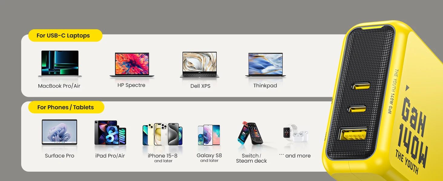 AOHi Youth140W Charger is compatible with MacBook Pro 16, 15, 14, 13″, MacBook Air, Dell XPS 15/13, HP Spectre/HP Chromebook, iPad Pro, iPhone 16/15 Pro/14 Pro Max/13/12, Galaxy S23 Ultra/S22, Switch, Steam Deck, and More; Support Samsung 45W super fast charge 2,0 charging protocol; Dell laptop series cannot be charged at full speed due to charging protocol restrictions