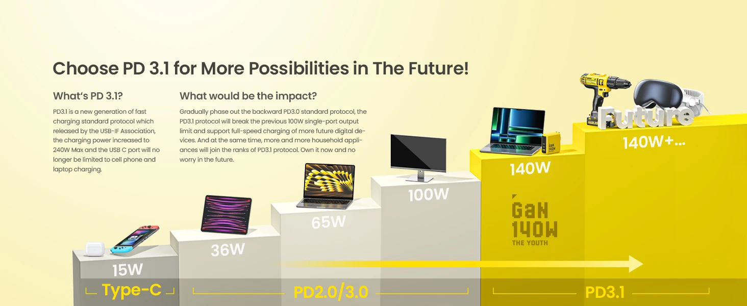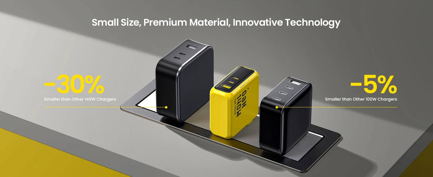 Revolutionary GaN technology combined with a foldable plug reduce the AOHI Youth 140W size by 30% compared to original 140W chargers, and it’s also 5% smaller than other 100W usb c chargers in size; Meaning a more portable charger in your palm without sacrifices in power. At around 11 ounces, this charger uses a reinforced structure and premium chips. It’s slightly heavier than most 100W chargers but comparable to 140W chargers. Meanwhile, this 140W charger is easily compatible with almost all 100W devices. While meeting all your charging needs, this PD 3.1 140W charger will bring you more possible charging experience about PD 3.1 in the future