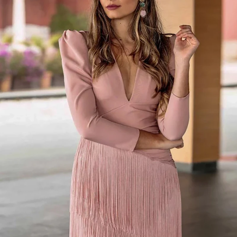 Autumn Long Sleeve Spliced Tassel Party Dresses Woman Elegant Deep V Neck Sheath Long Dress Fashion Solid Pleated Bohemian Dress