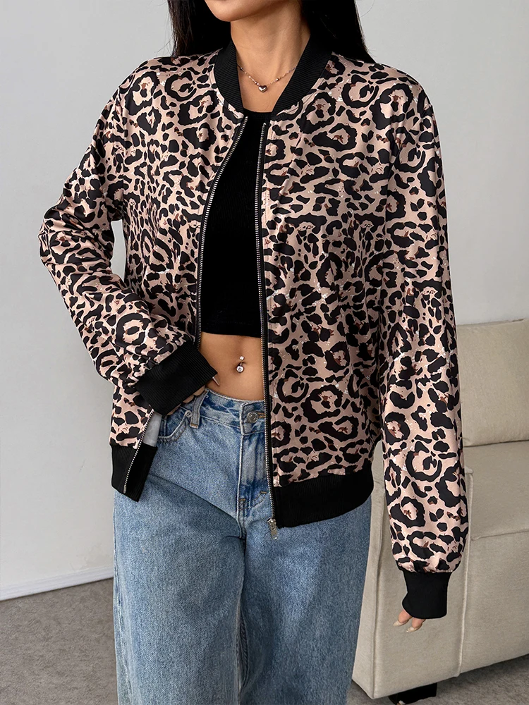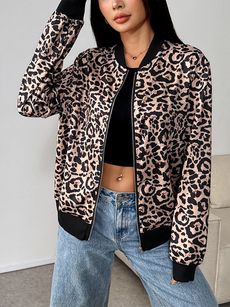 Autumn New Women’s Tops Coat Streetwear Fashion Long Sleeves Leopard Print Zippers Hoodie Casual Slim Female Versatile Clothing