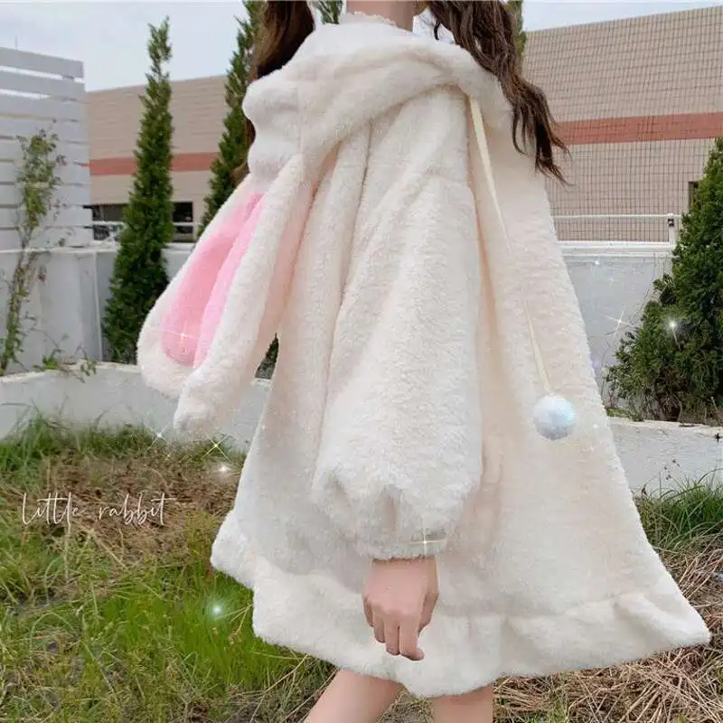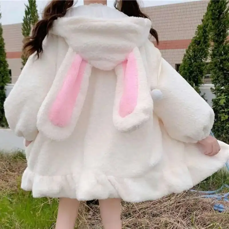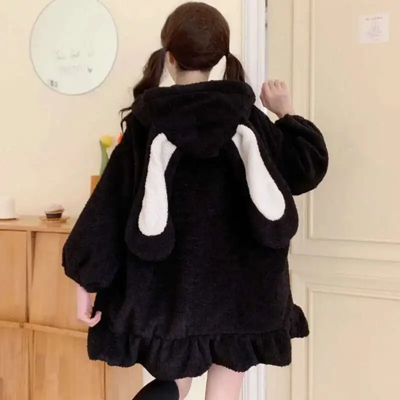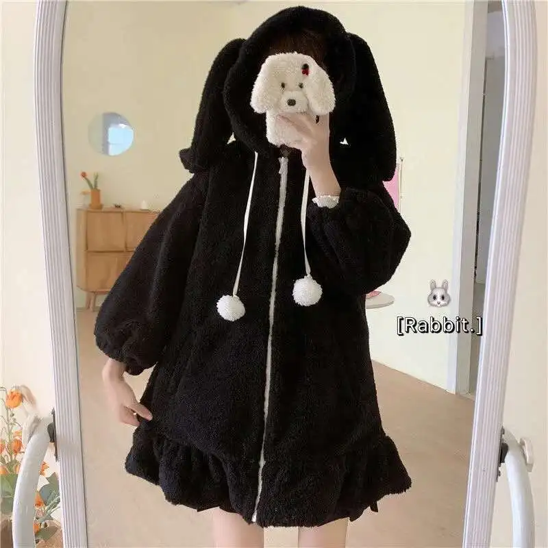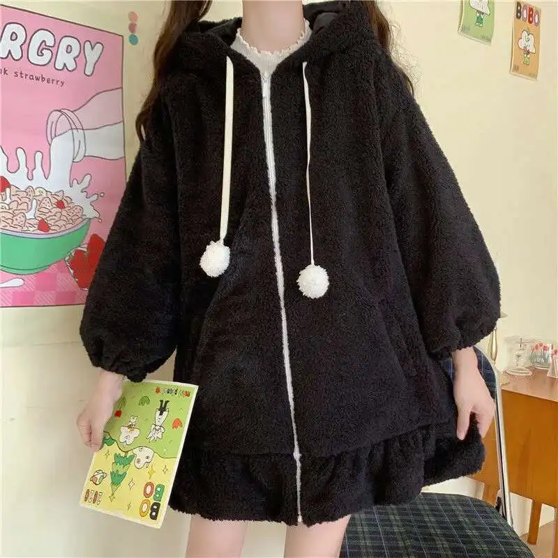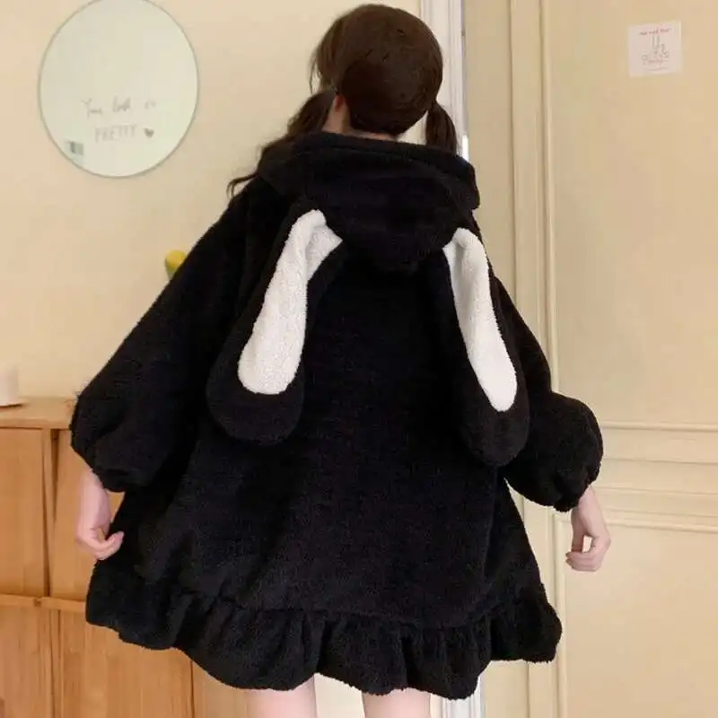 Autumn Winter Women Harajuku Kawaii Rabbit Ear Hooded Sweatshirt Loose Long Ruffle Hem Fleece Hoodie Cute Warm Zip-Up Streetwear