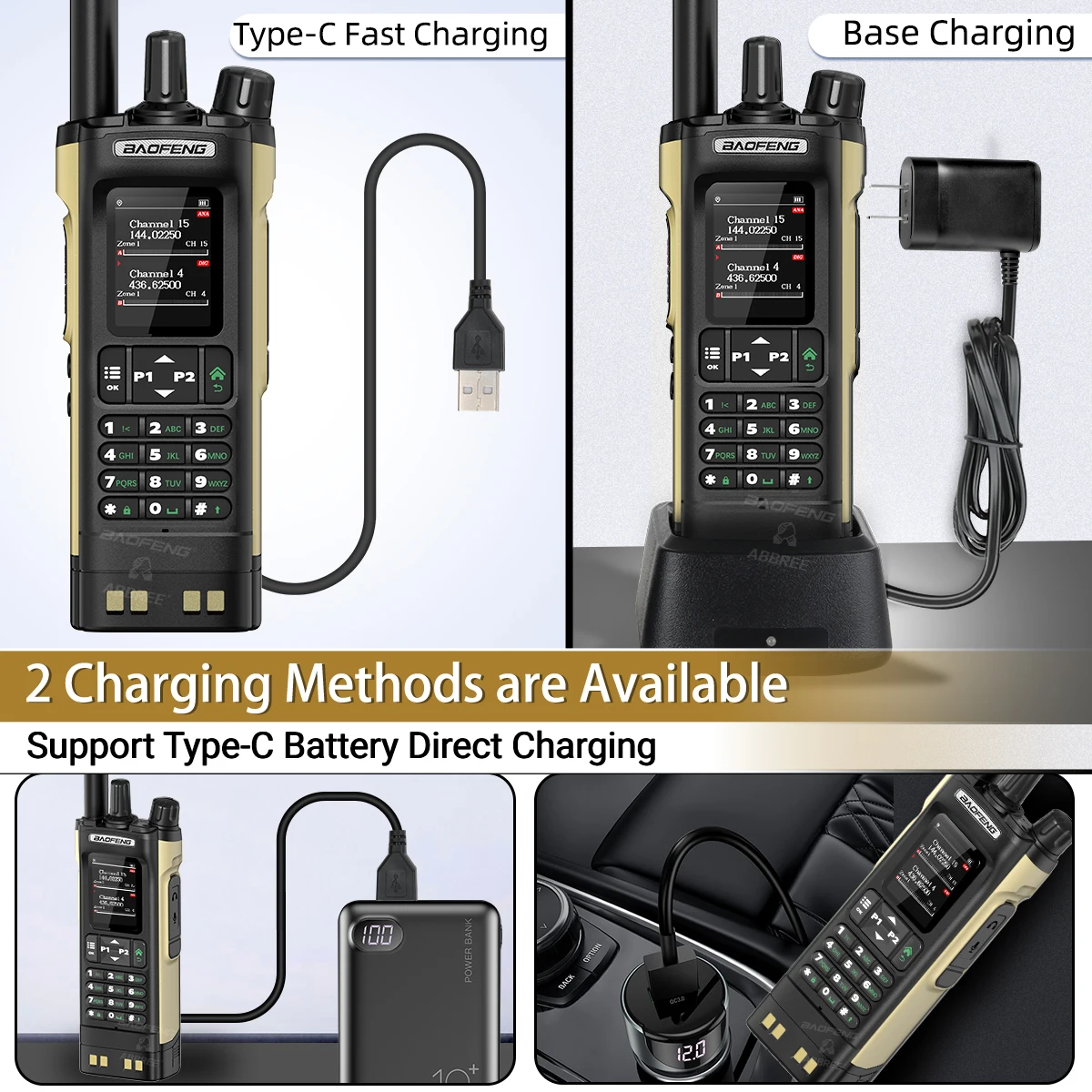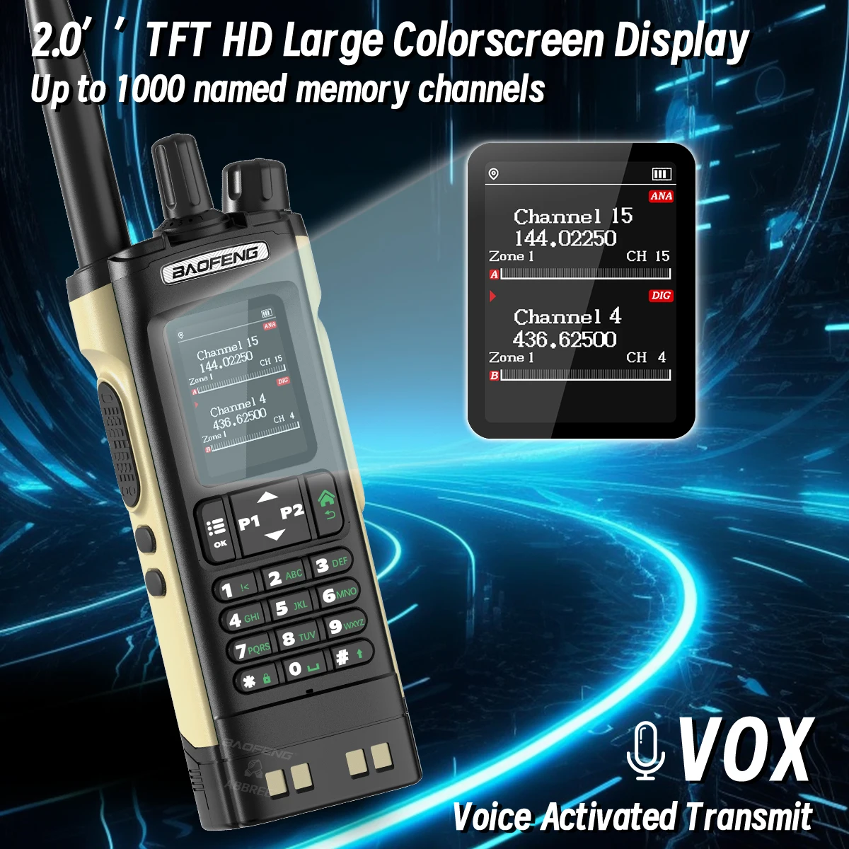 BAOFENG DM-32 digital walkie talkie with AM:108-136MHz,VHF:136-174MHz,UHF:400-470mHz, 4000 channels, dual mode (digital, analog) .Direct mode dual slot communication achieves two groups of calls at a frequency point at the same time so that the communication efficiency is doubled and frequency resources are saved.