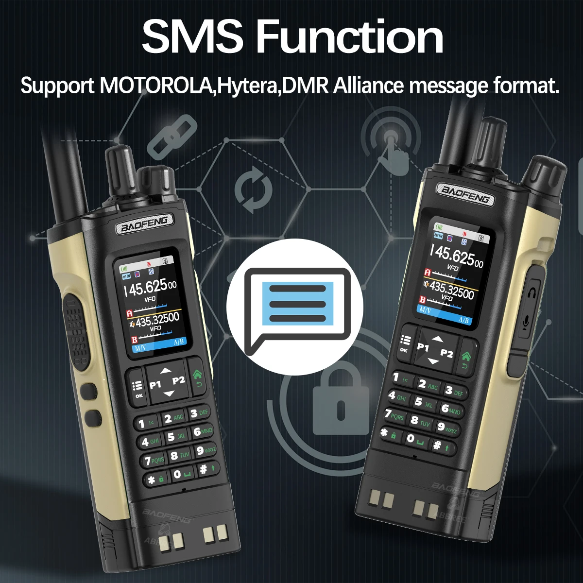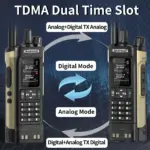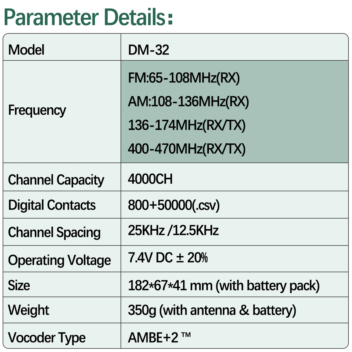 BAOFENG DM-32 digital walkie talkie with AM:108-136MHz,VHF:136-174MHz,UHF:400-470mHz, 4000 channels, dual mode (digital, analog) .Direct mode dual slot communication achieves two groups of calls at a frequency point at the same time so that the communication efficiency is doubled and frequency resources are saved.