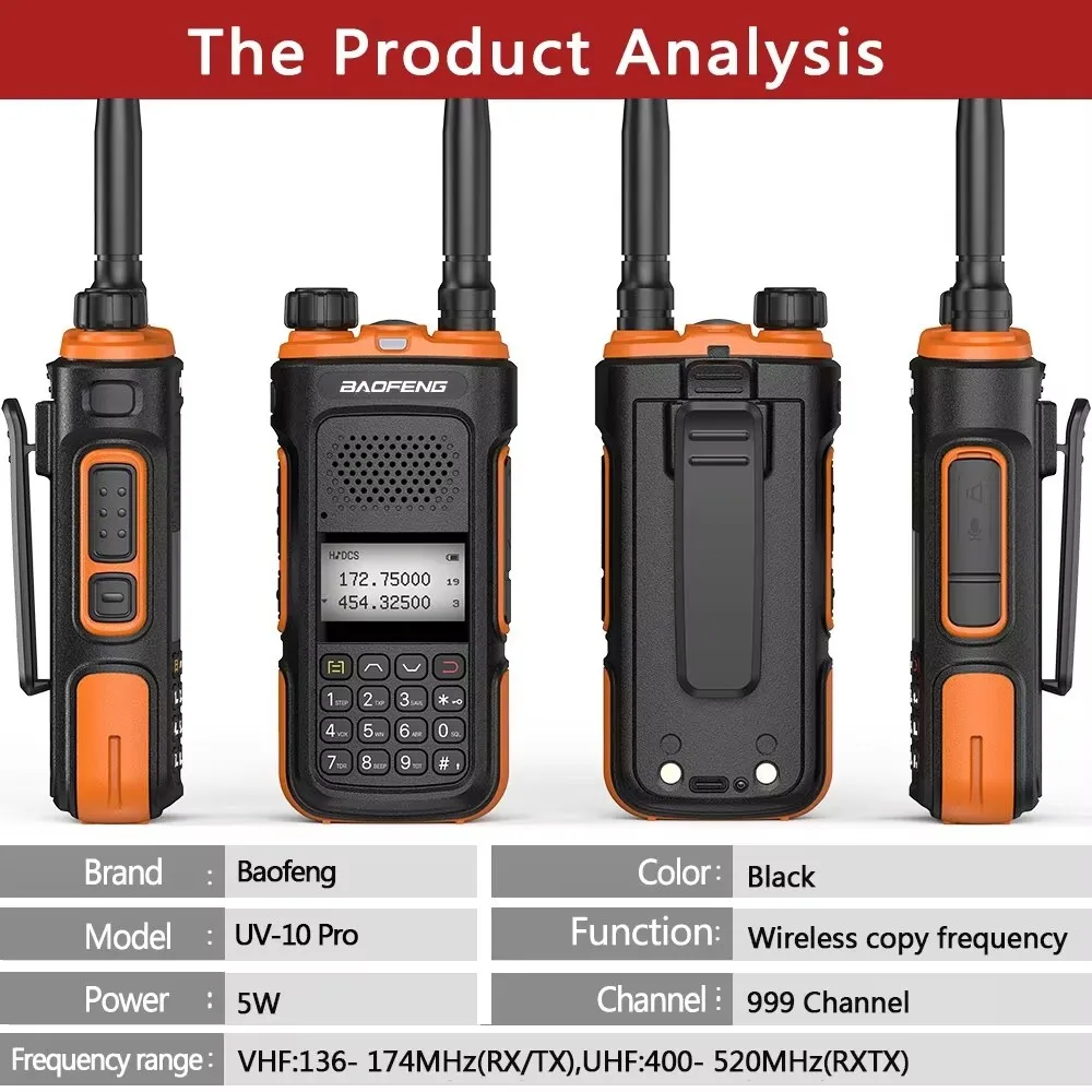 UV-10 Pro is a professional ham radio high power. Up to 999 channels.1.44 inch color screen.【Frequency]]136-174MHz/400-480Mhz