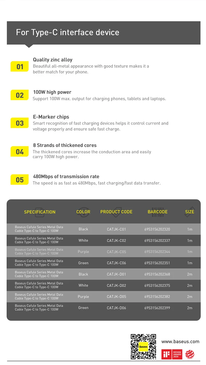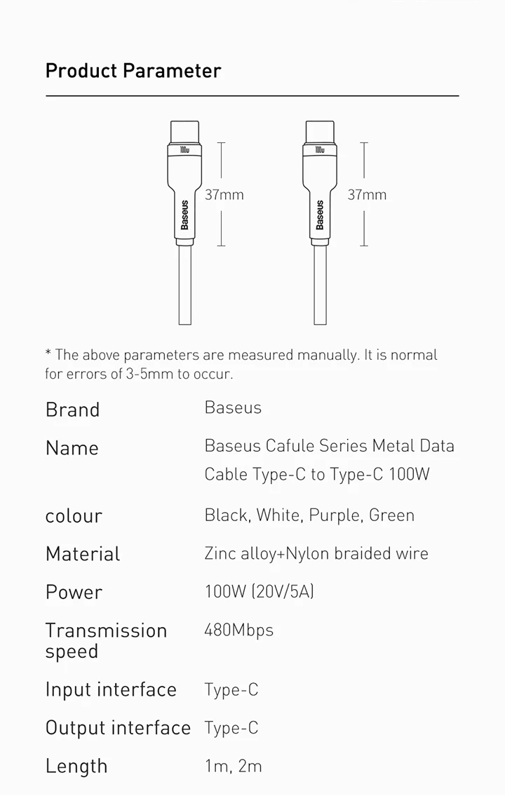 Baseus 100W USB C to USB Type C Cable For iPhone 15 Plus Promax USB C Fast Charger Cable for Xiaomi Redmi Note 8 Pro Samsung S20