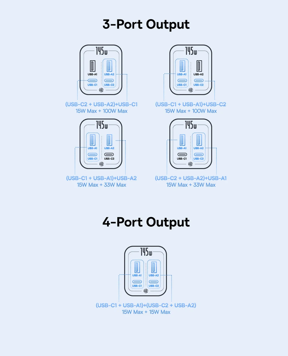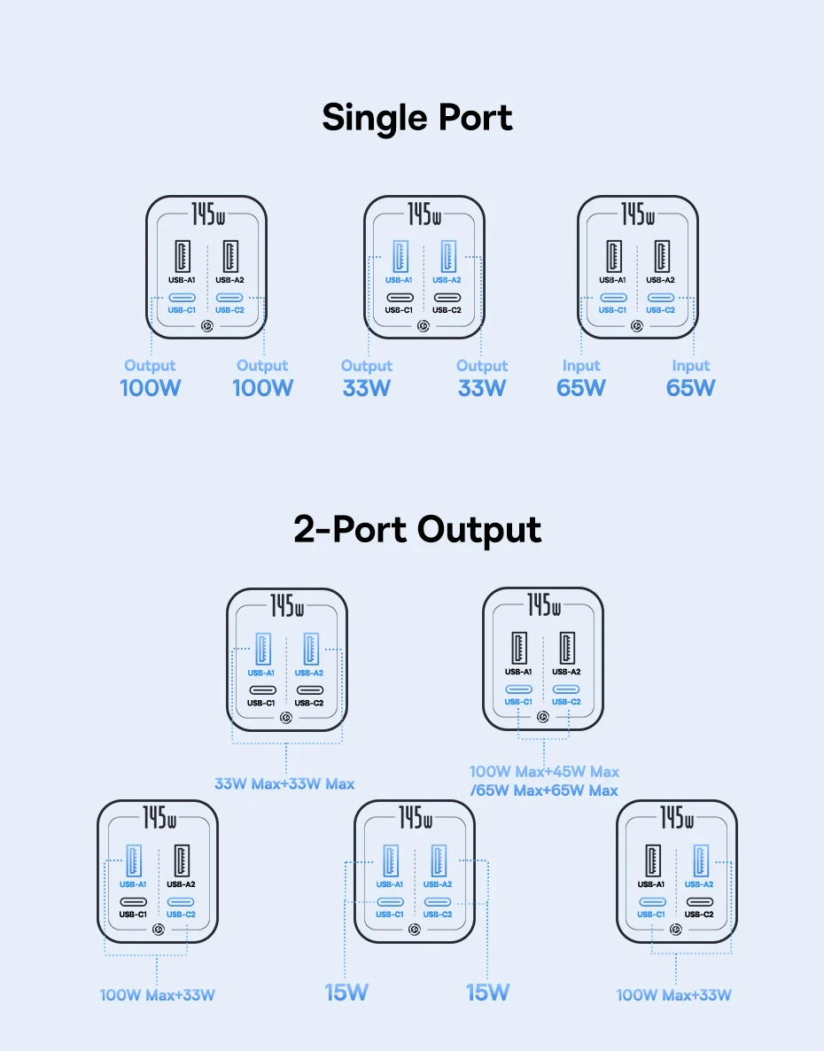 the maximum output can reach 145W, the maximum out of either single port is 100W.