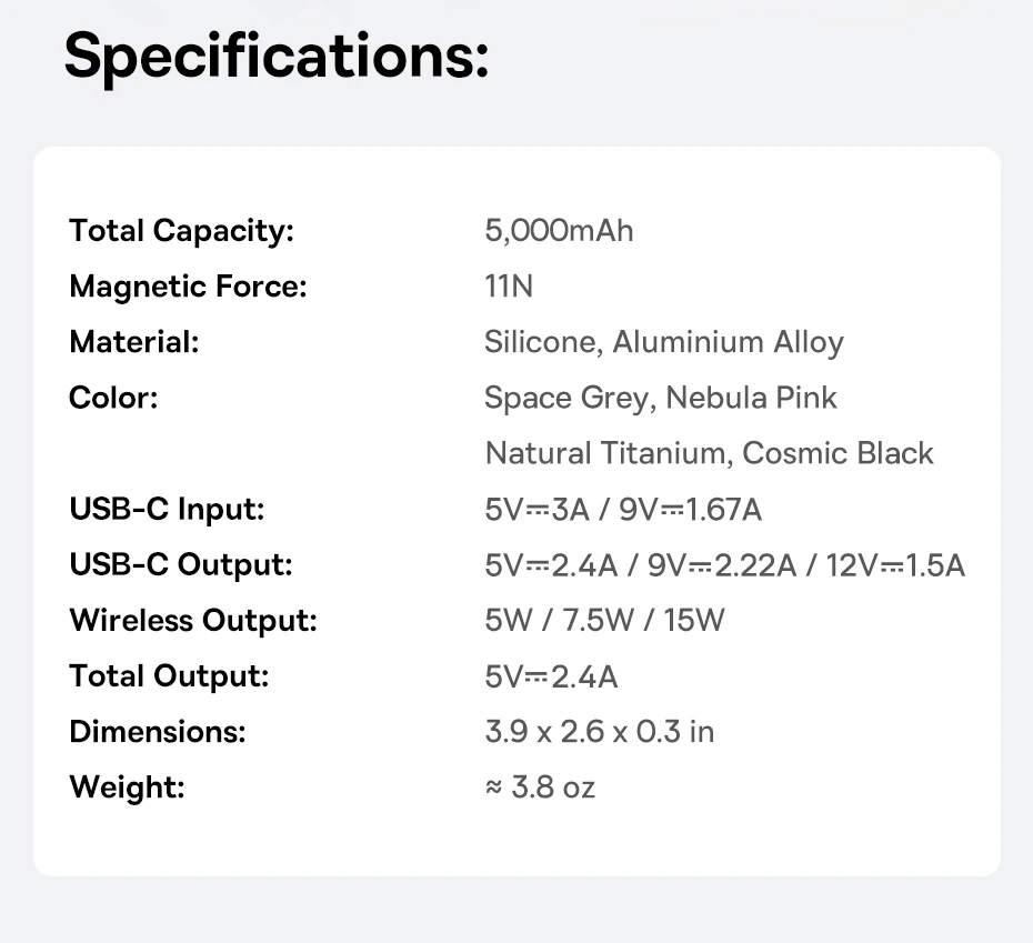 • Output Interface: USB-Type C,Wireless Charger