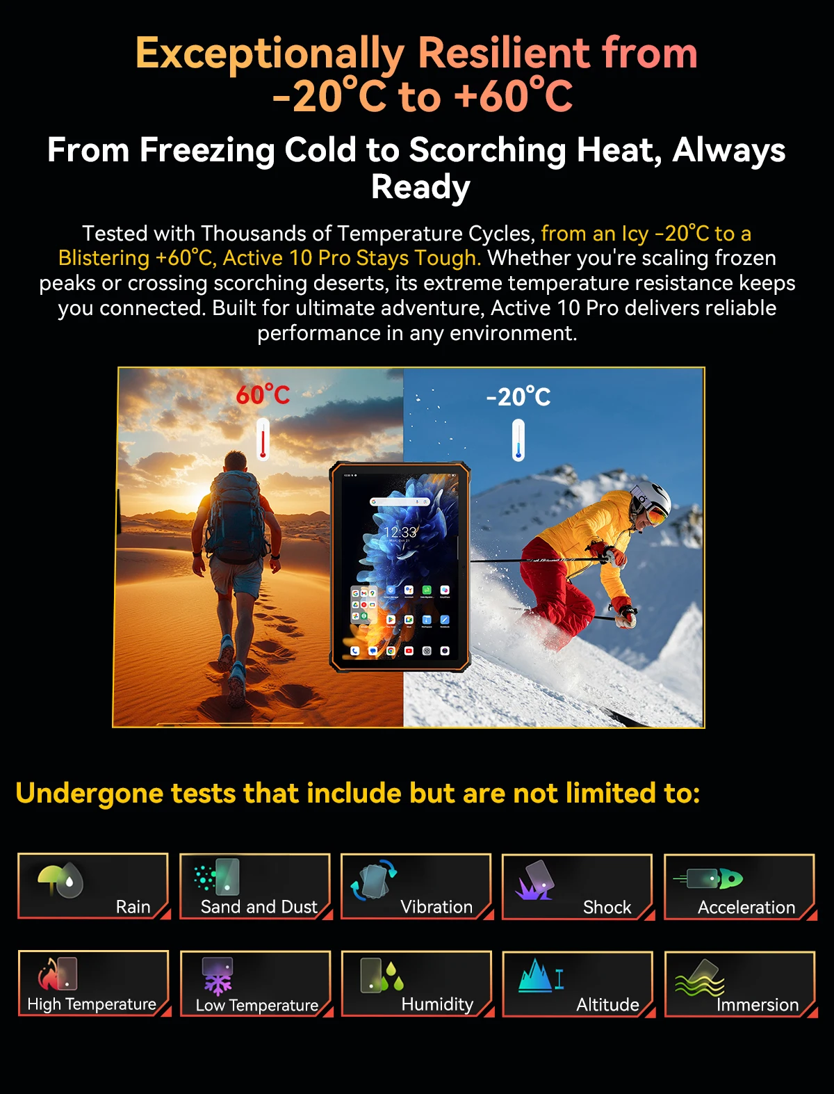 Tested with Thousands of Temperature Cycles,from an Icy -20°C to a Blistering +60°C, Active 10 Pro Stays Tough. Whether you’re scaling frozen peaks or crossing scorching deserts, its extreme temperature resistance keeps you connected. Built for ultimate adventure, Active 10 Pro delivers reliable performance in any environment.