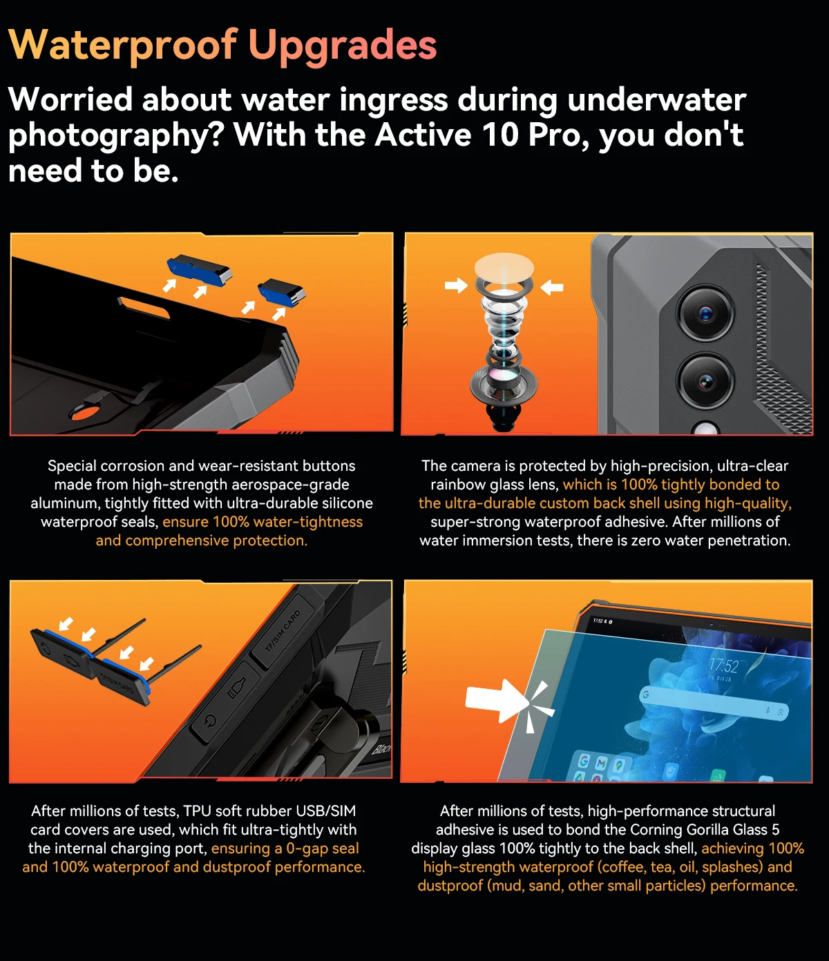 • The camera is protected by high-precision, ultra-clear rainbow glass lens, which is 100% tightly bonded to the ultra-durable custom back shell using high-quality, super-strong waterproof adhesive. After millions of water immersion tests, there is zero water penetration.