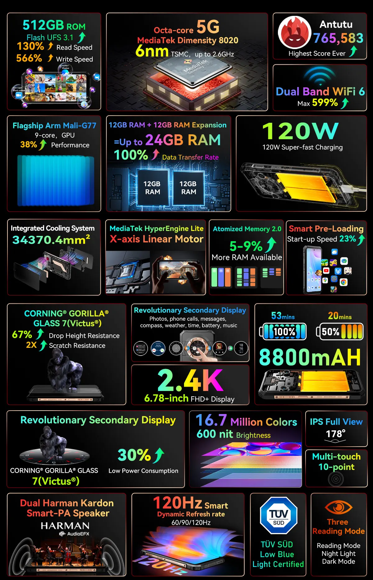 Main Display :6.78 inch FHD+,1080*2460 ResolutionCorning Gorilla Glass Victus; 120Hz Refresh Rate