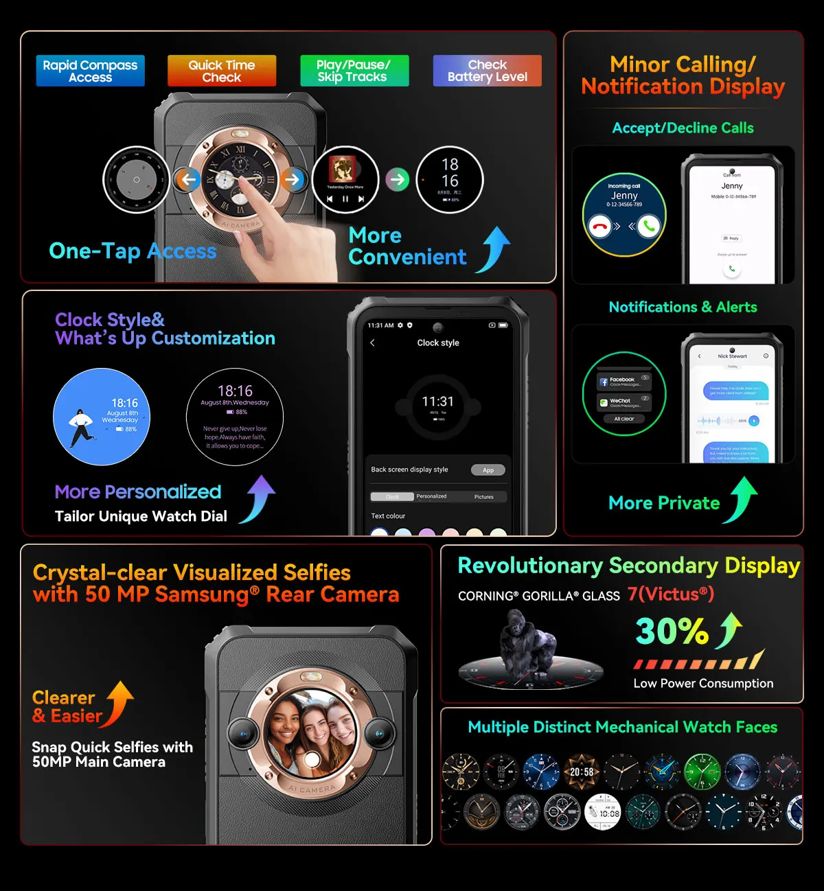 Back Display :1.32 inch, 360*360 Resolution;CORNING® GORILLA*GLASS 7(Victus): 60Hz Refresh