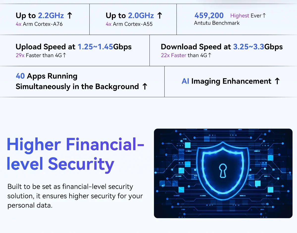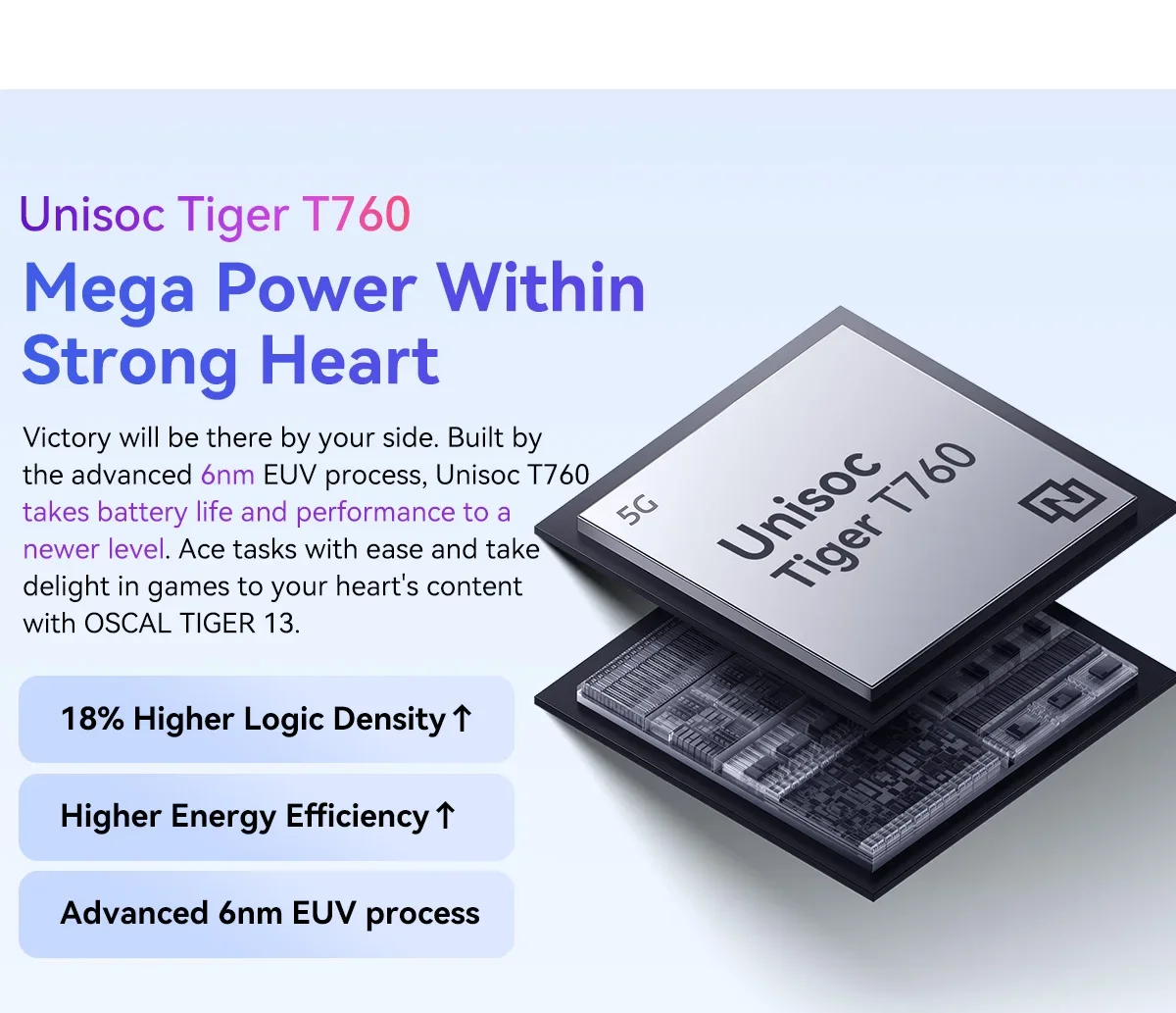 CPU : 5G Unisoc T760; octa-core; 4*A76@2.2GHz+4*A55@2.0GHz