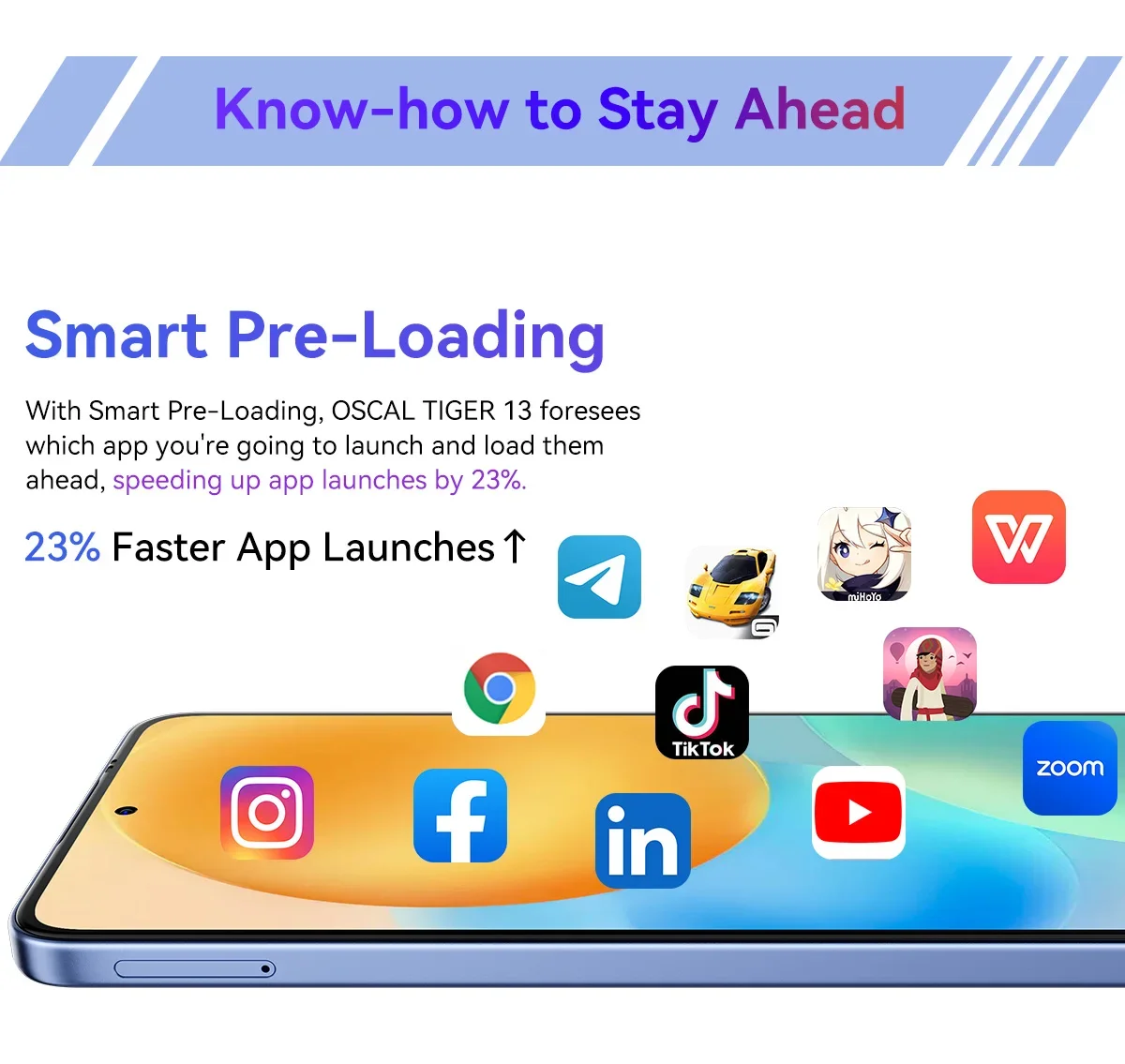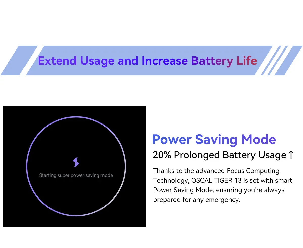 Embark on your digital adventure with OSCAL TIGER 13 without worries about power shortages. Enjoy games for hours on end and stay connected with your loved ones. With 18W Fast Charging, soon go back to 20% in the mood within 20mins.