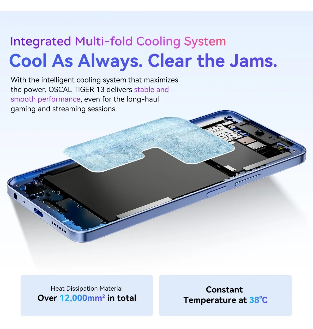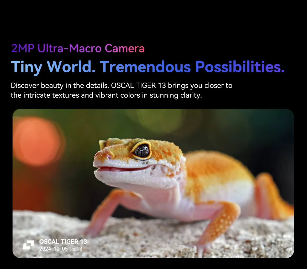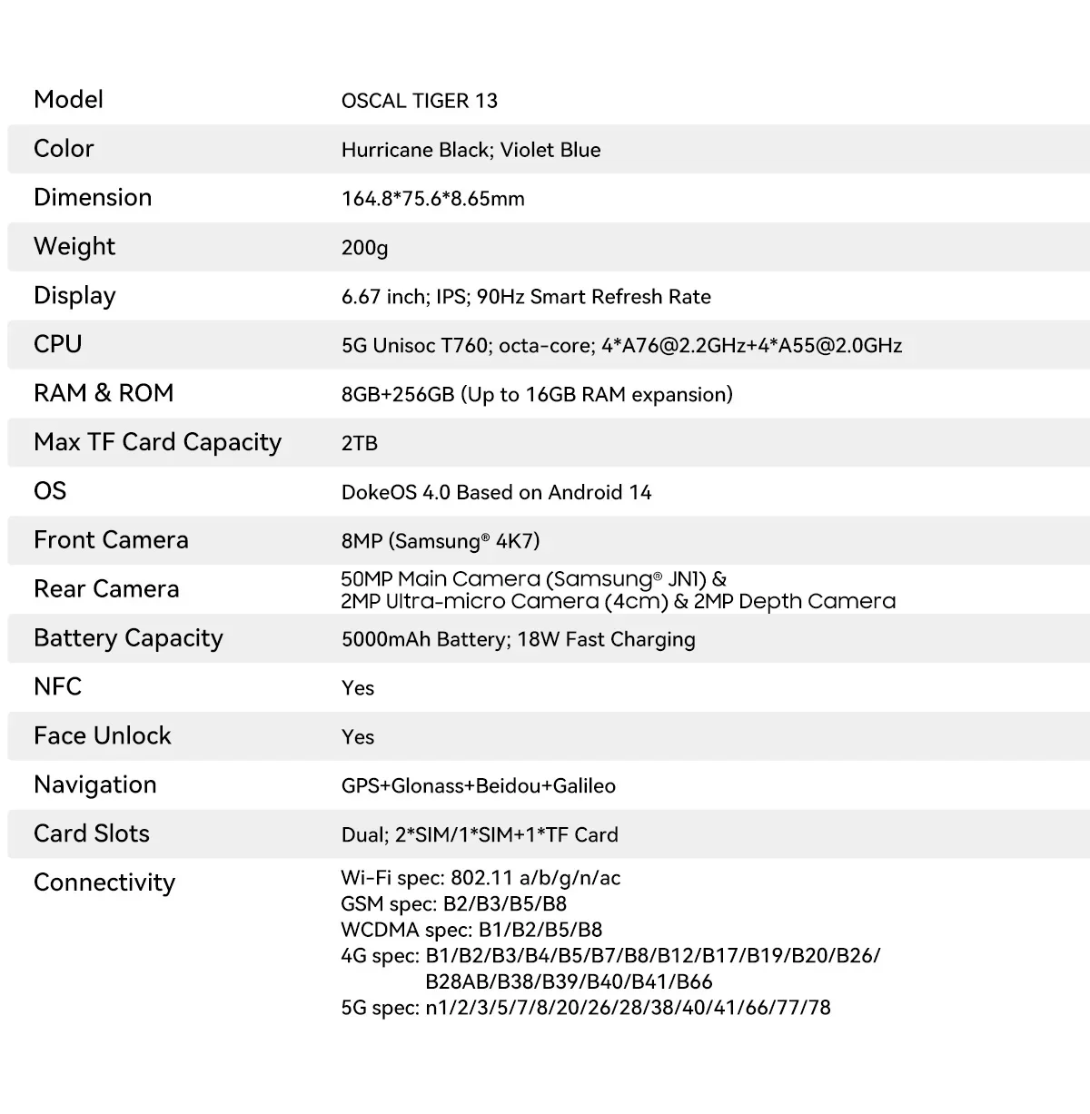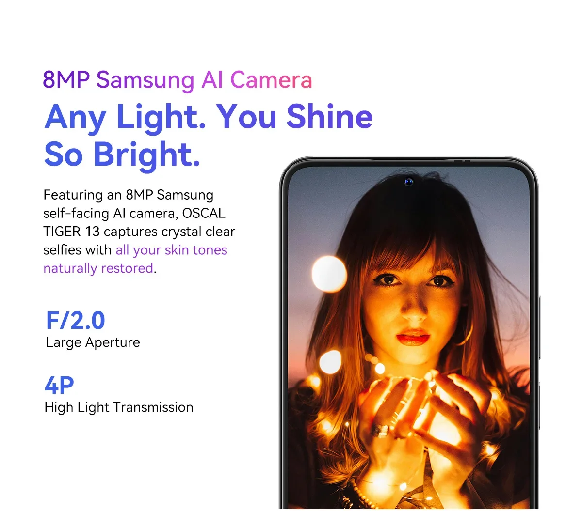 Featuring an 8MP Samsung self-facing AI camera, OSCAL TIGER 13 captures crystal clear selfies with all your skin tones naturally restored.