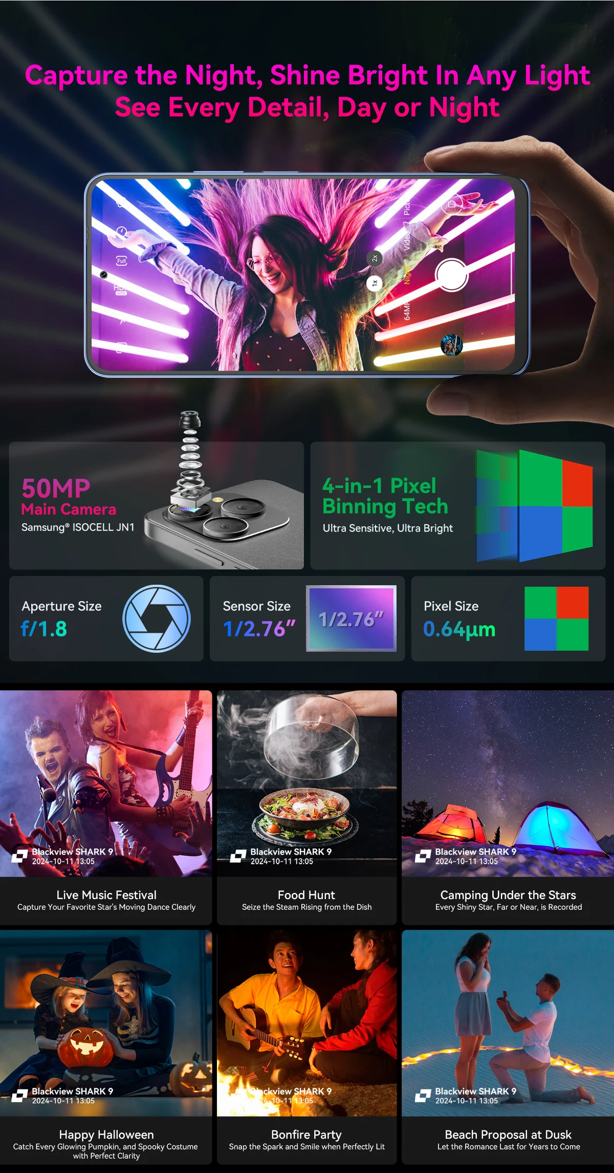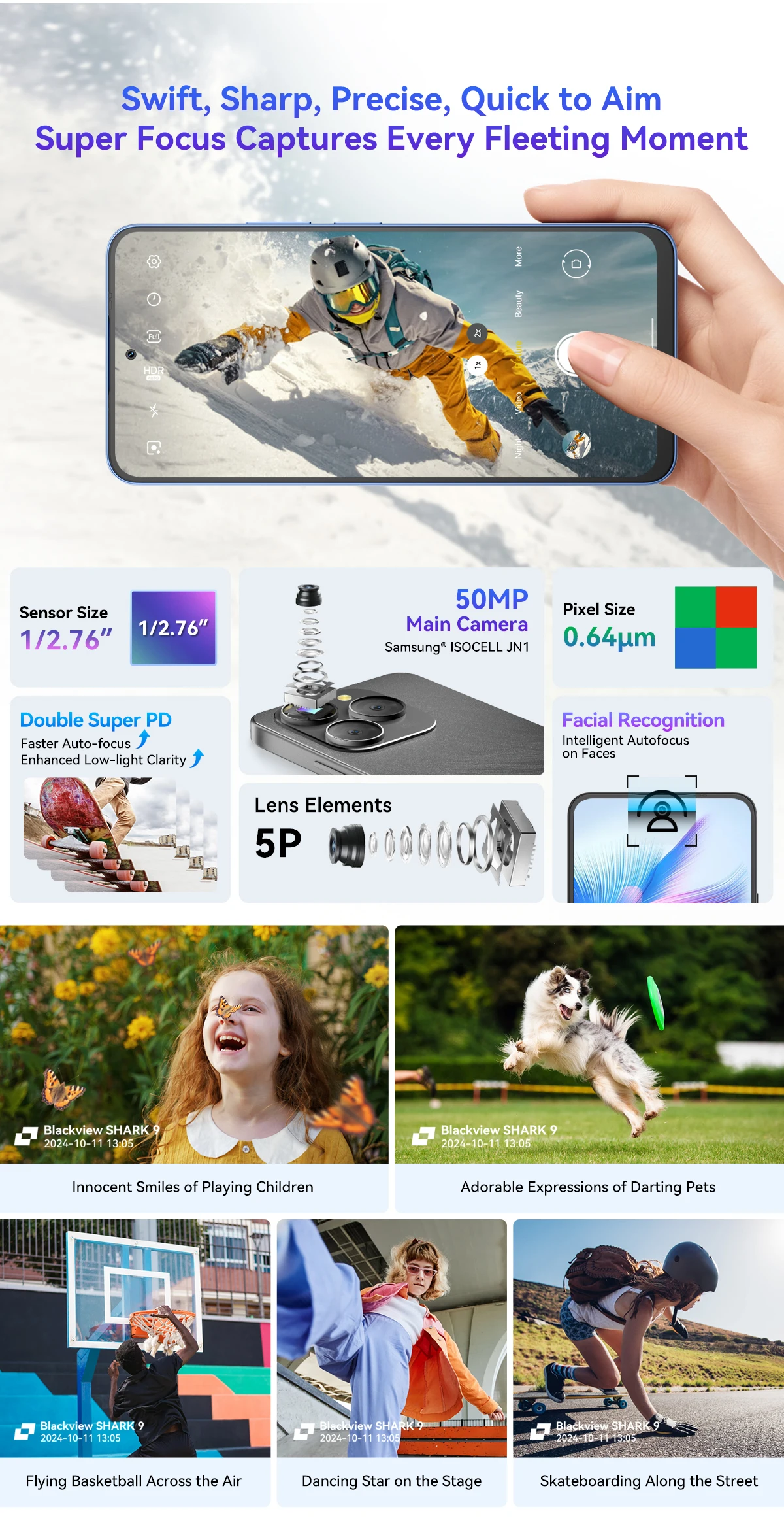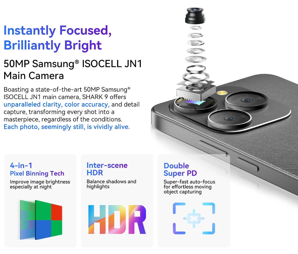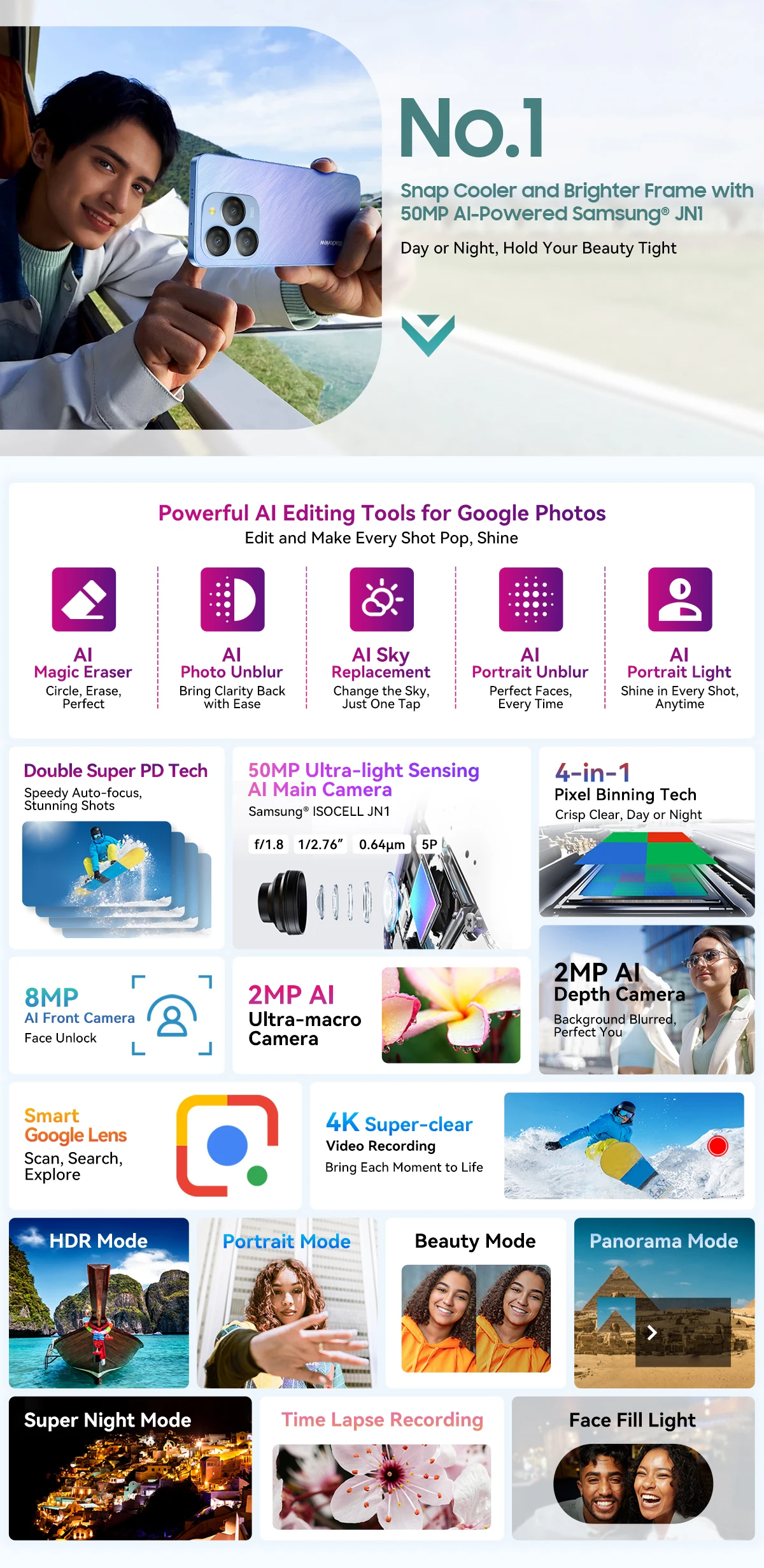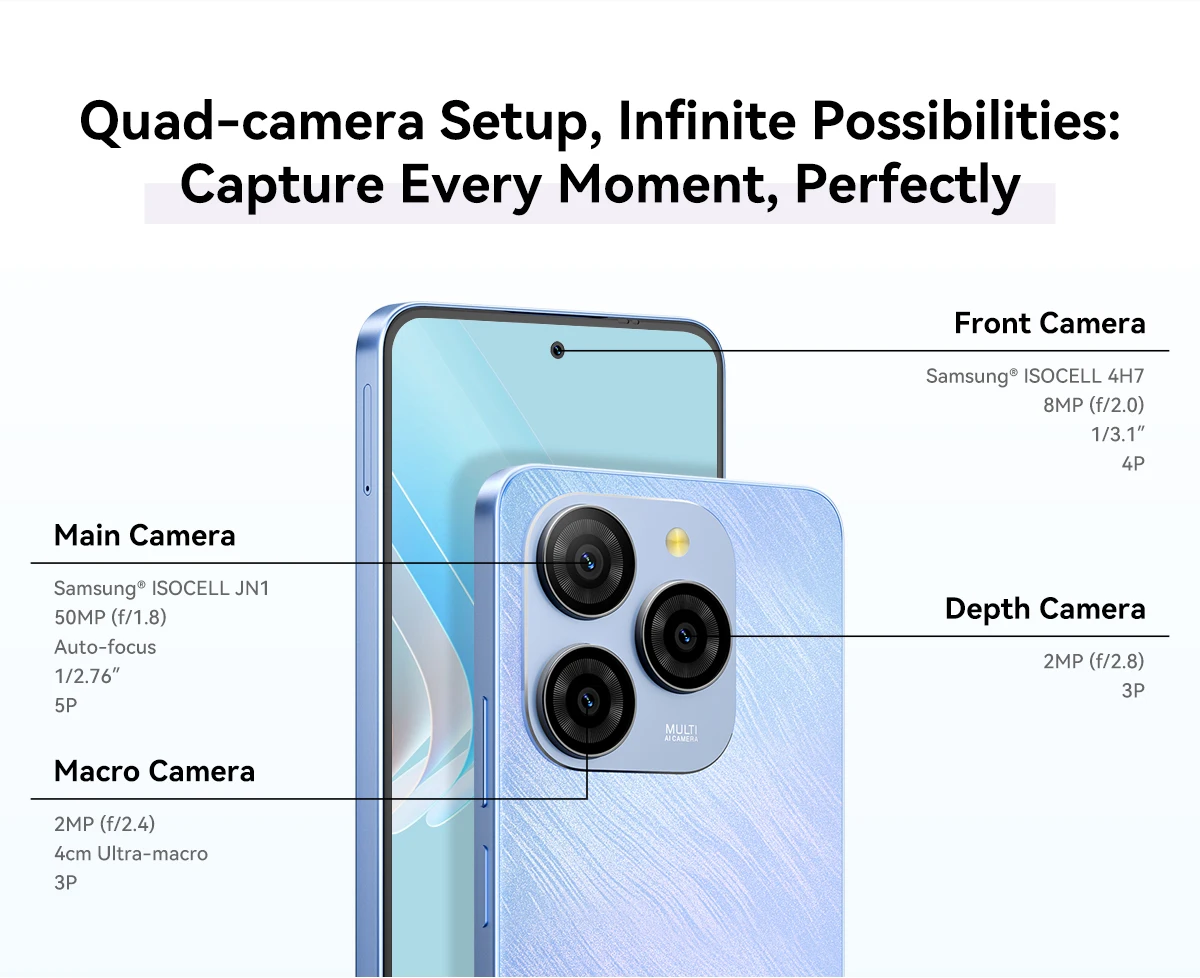 Rear Camera : 50MP Ultra-light Sensing AI Main Camera Samsung® ISOCELL JN1