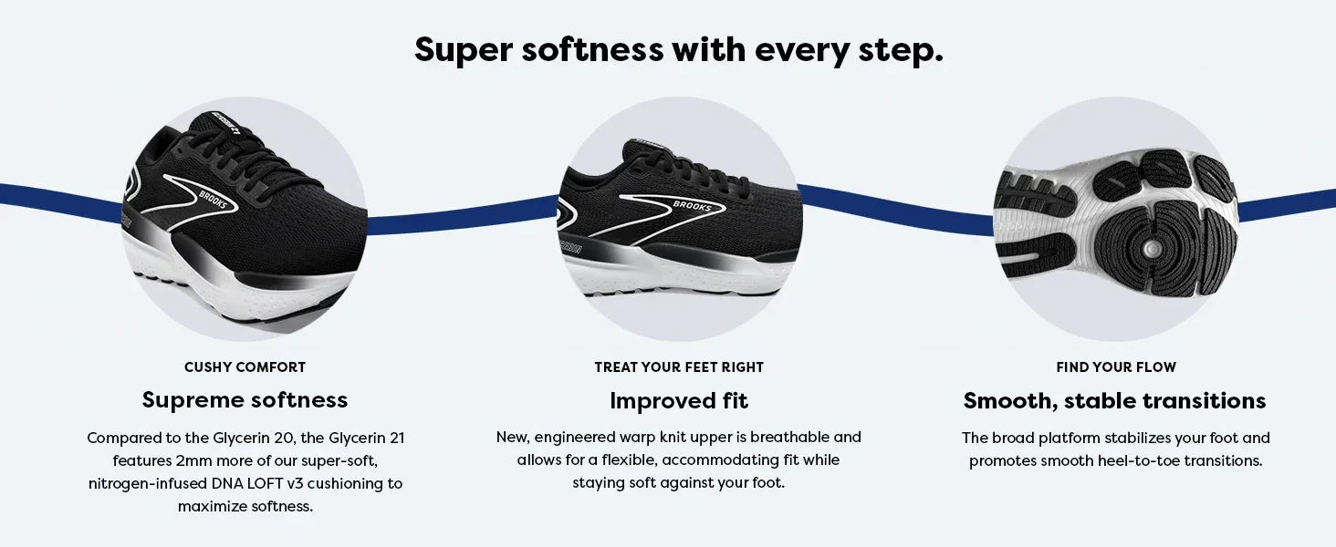 - THIS MEN’S SHOE IS FOR: The Glycerin 21 is perfect for runners seeking super-soft cushioning for supreme comfort. The plush internal fit and soft, stable transitions keep runners surrounded by super-softness. This Brooks Glycerin 21 has been granted the APMA Seal of Acceptance.