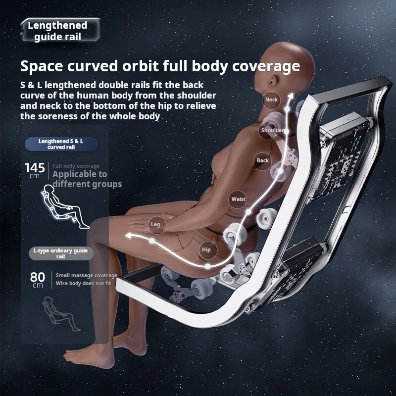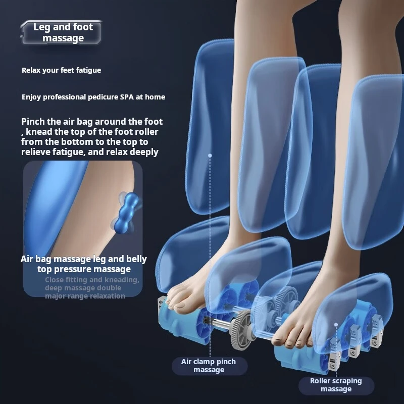 9.Shoulder massage: shoulder airbag massage;Hip massage: robot walking massage;Foot massage: roller kneading massage Massage technique: kneading, finger pressing, massage, tapping and tapping