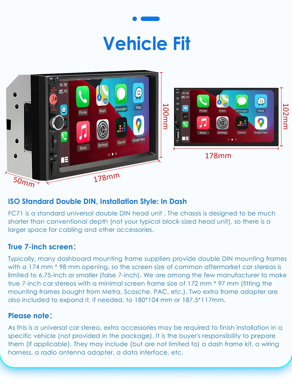 Function: Bluetooth, Charger, Mobile Phone, MP3 Players, Radio Tuner, Touch Screen