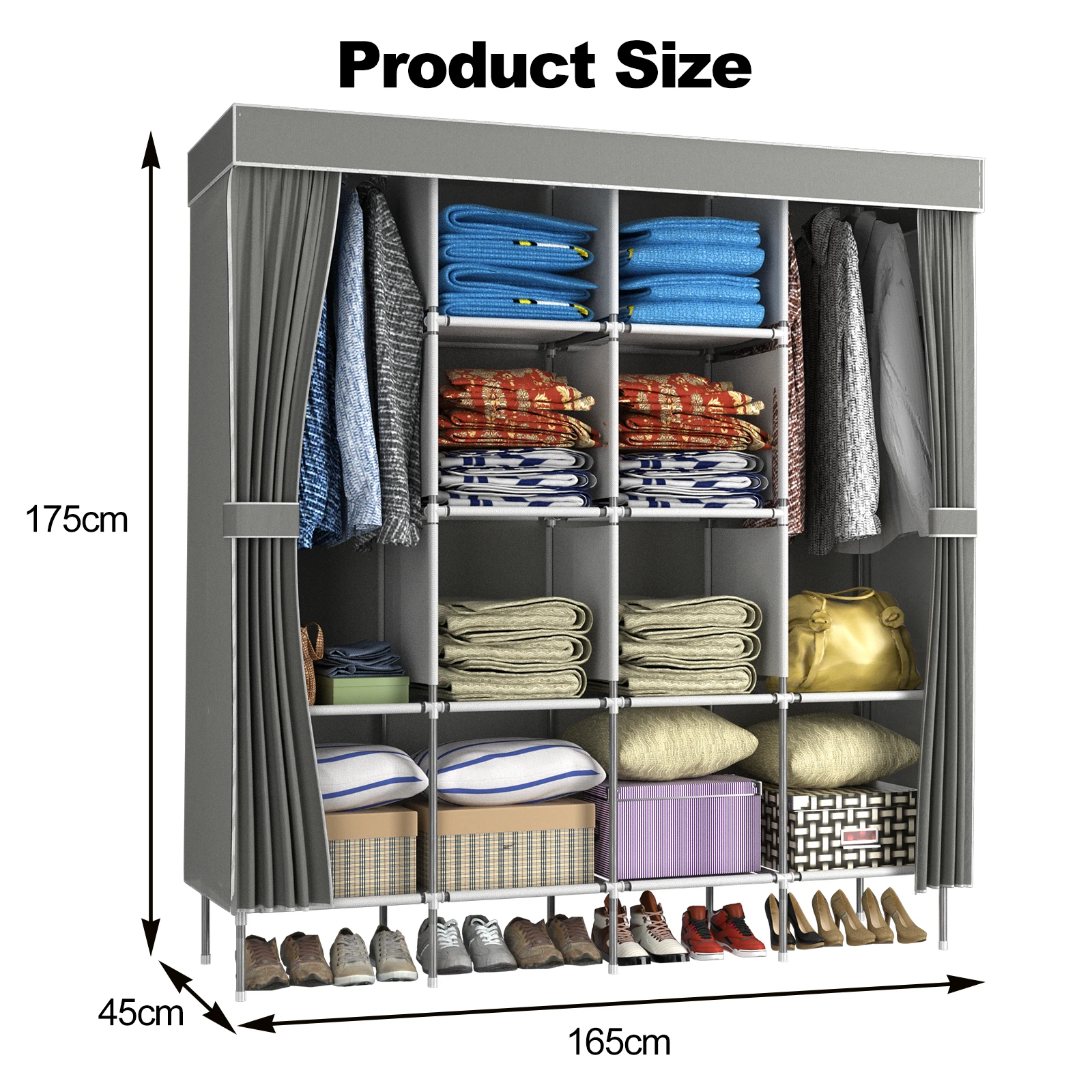 Product SizeOverall Dimensions: 165 x 45 x 175cm. The widened four-column design provides you with more storage space for clothes, toys, bed linen and more. Storage capacity max. |