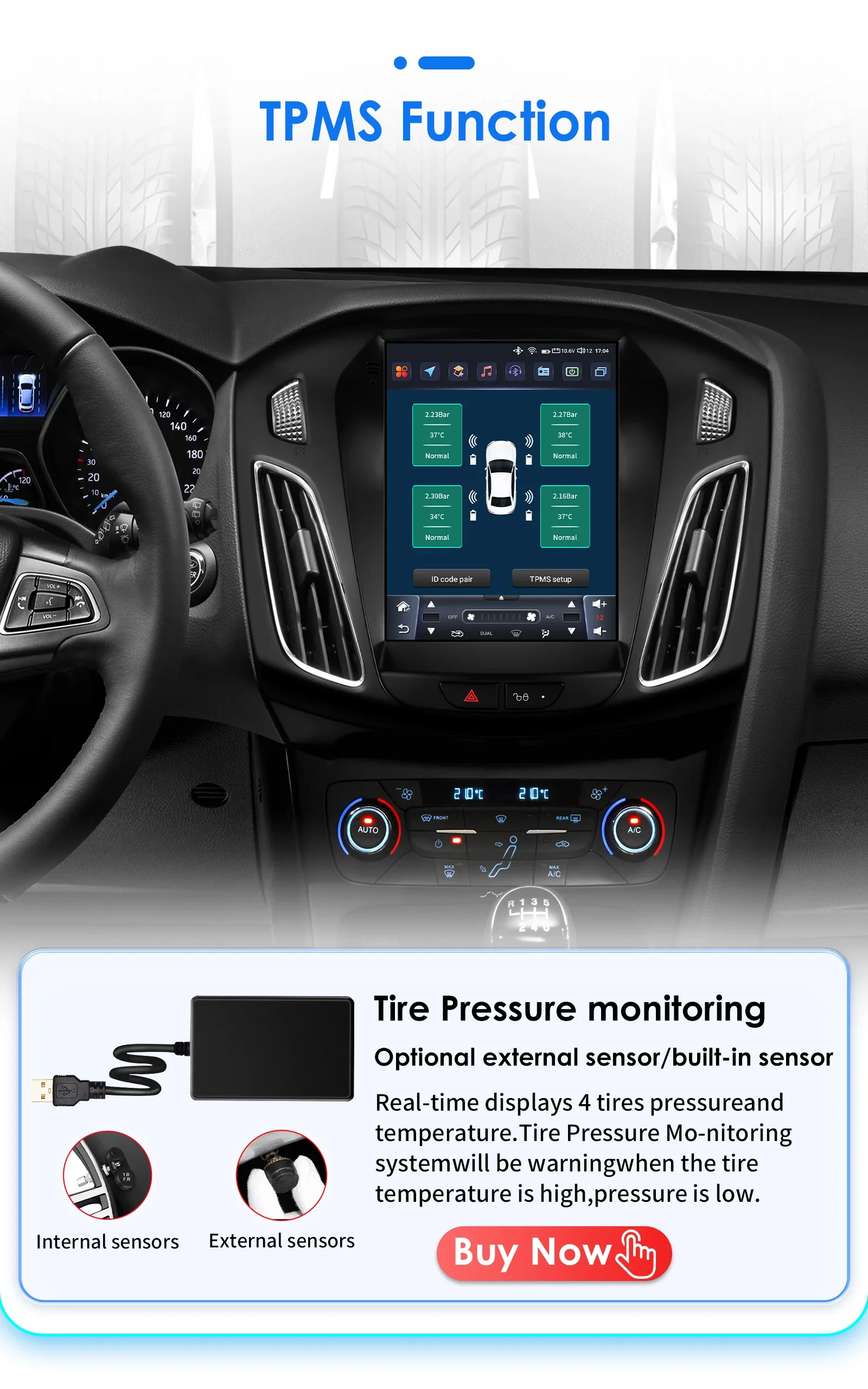 TPMS Function( Needs to order separately) : Tire Pressure Monitoring: Real-time displays 4 tires pressure and temperature,Tire Pressure Monitoring system will be warning when the tire temperature is high, pressure is low.