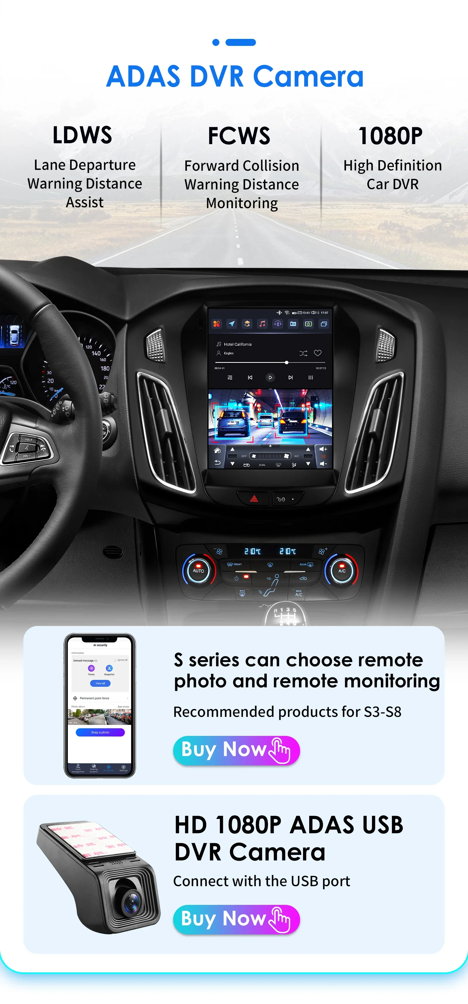 HD 1080P ADAS DVR Camera(Needs to order separately) –connect with the USB port: LDWS(Lane Departure Warning Distance),FCWS(Forward Collision Warning Distance), 1080P(High Definition Car DVR).