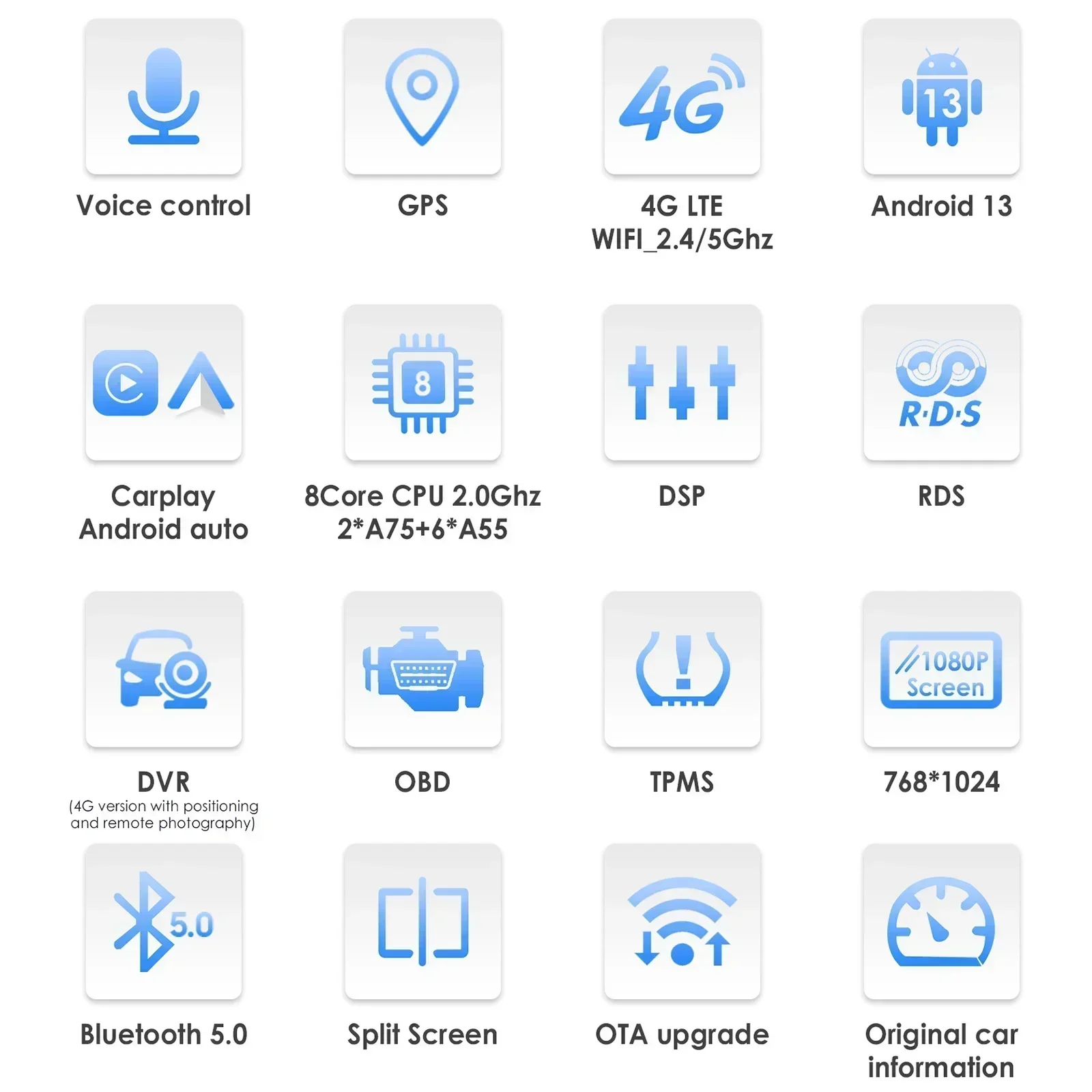 - Special Features: Built-in Gps,Mobile Phone,MP3 players,Voice Control,dsp,CarPlay,android auto,Reversing Input,Split Screen