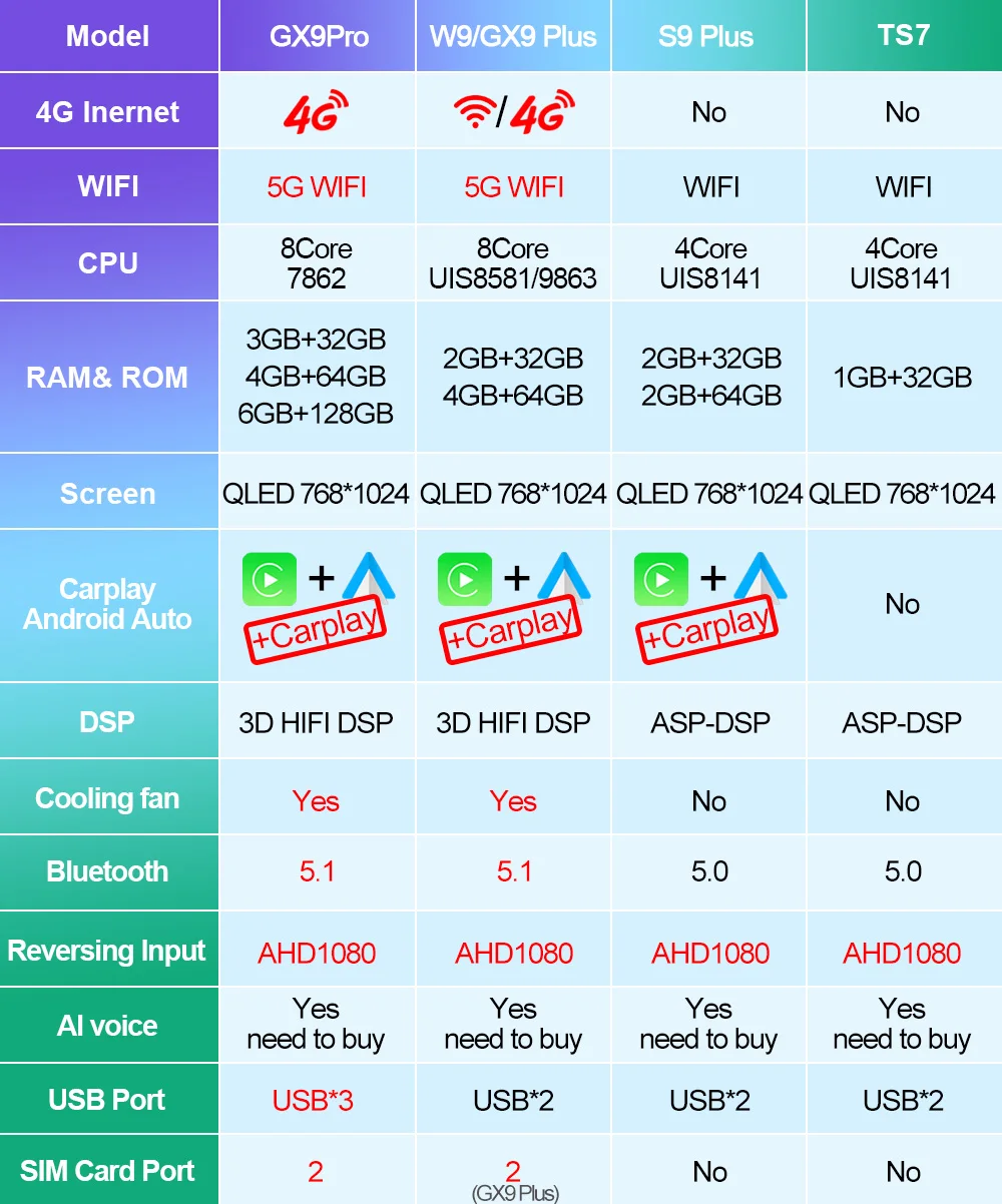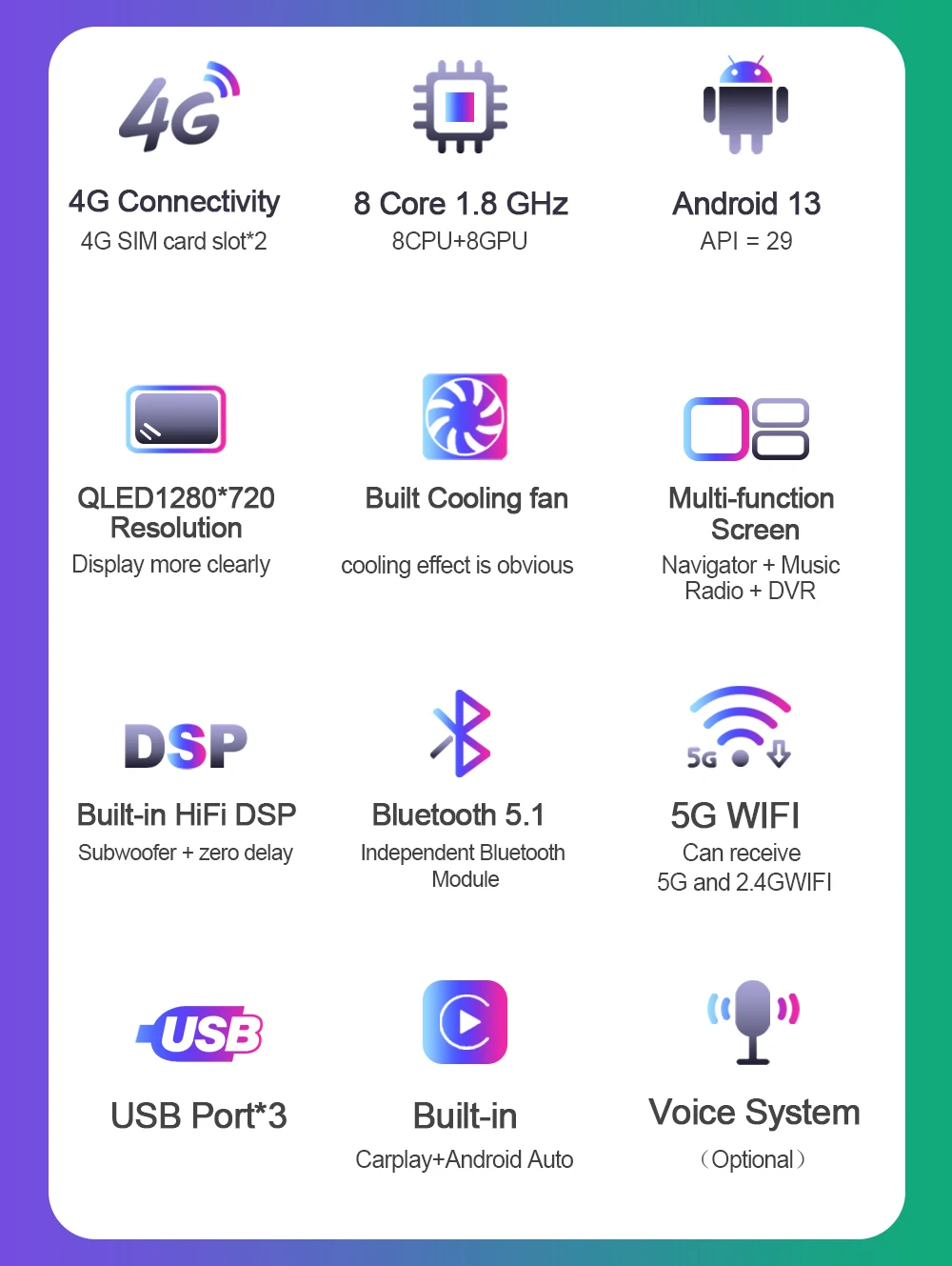• Special Features: Built-in Gps,Mobile Phone,MP3 players,Voice Control,dsp,CarPlay,android auto,Reversing Input,Split Screen