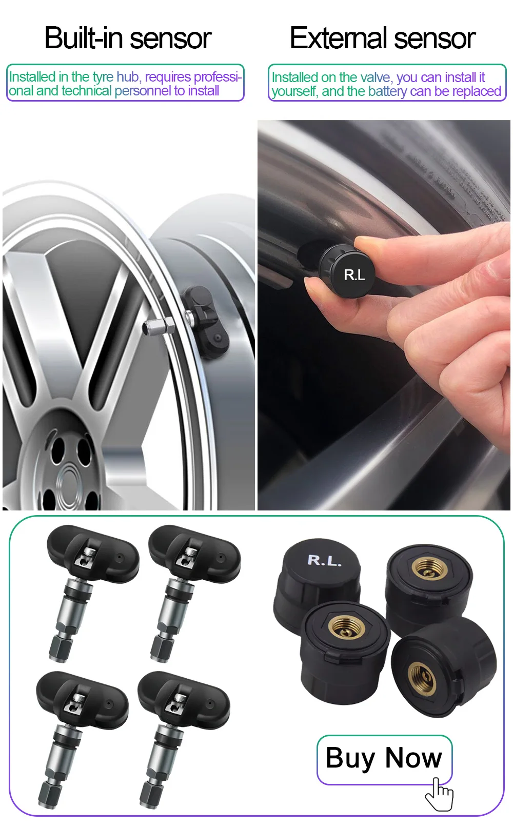 Real-time displays 4 tires' pressure and temperature, once the tirepressure or temperature limit is exceeded, alarm will be triggered.