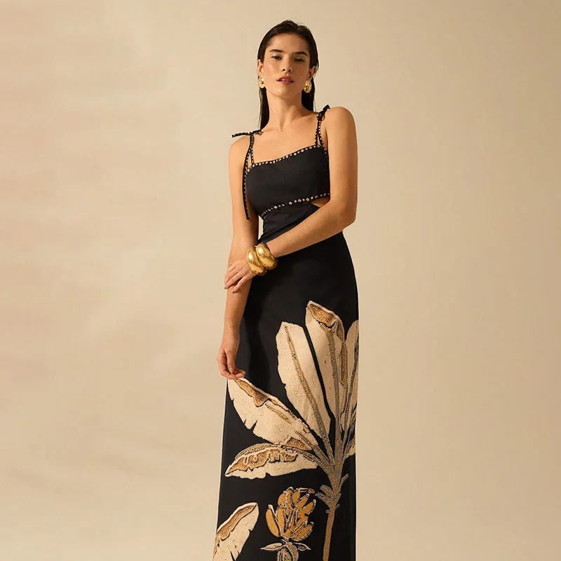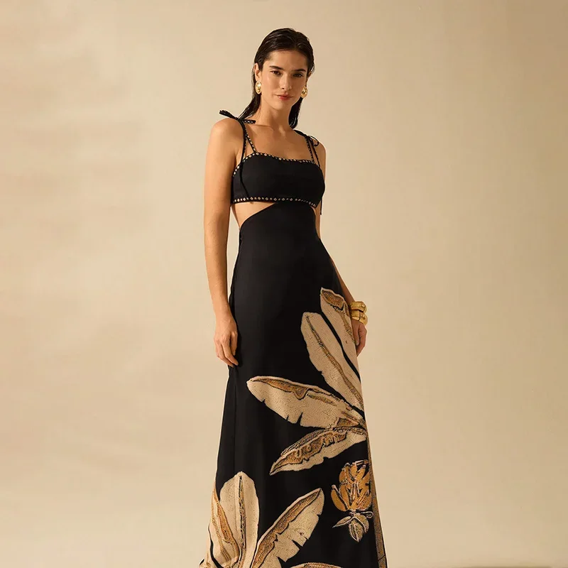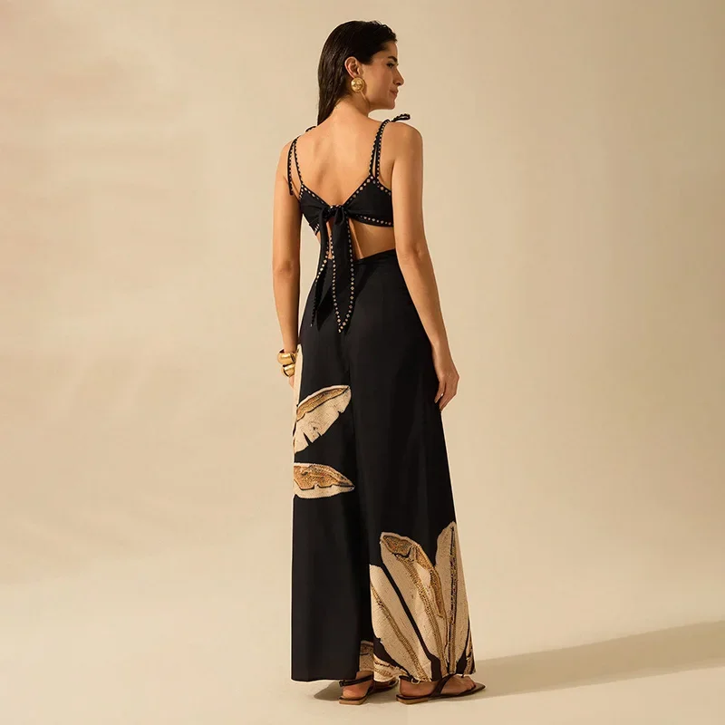 Chic Printed Backless Halter Dress Lace Up Slimming Maxi Dresses High Waist Party Robes 2025 New Lady Vacation Party Clothing