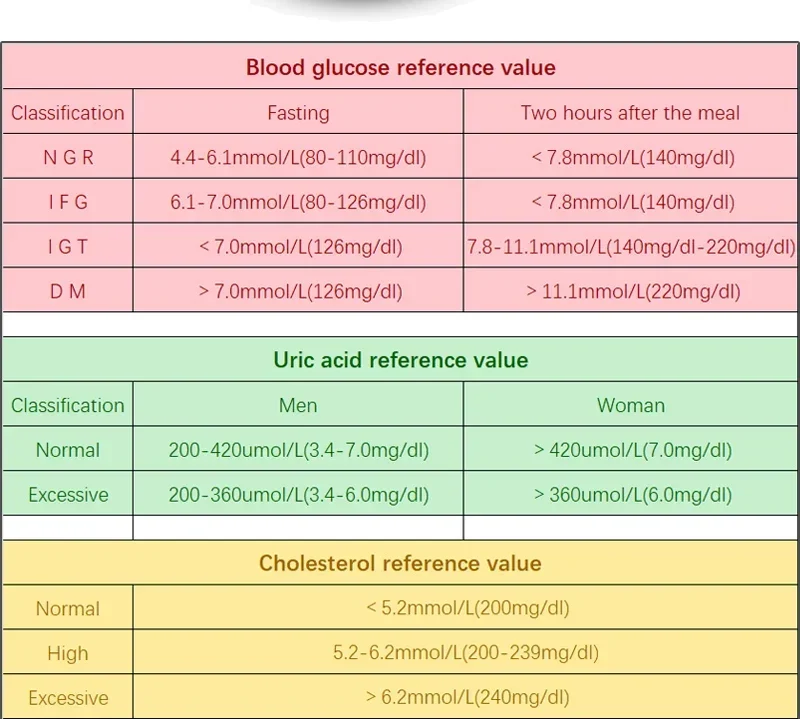 3. Cholesterol range: 2.4mmol/L ~ 11.5mmol/L (100mg/dL ~ 400mg/dL)
