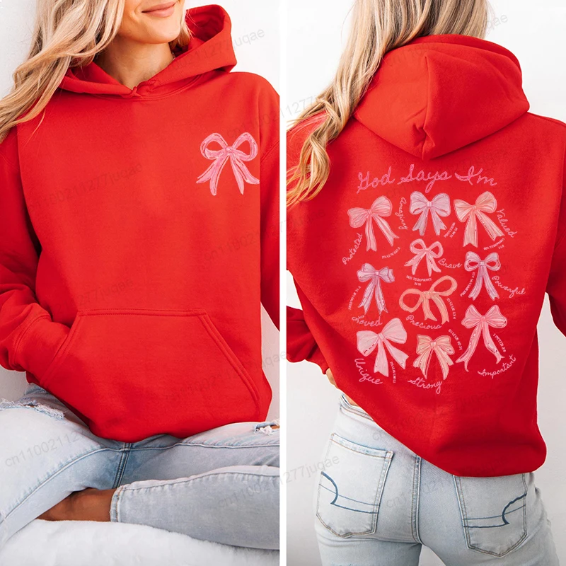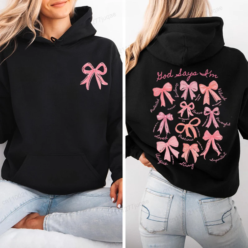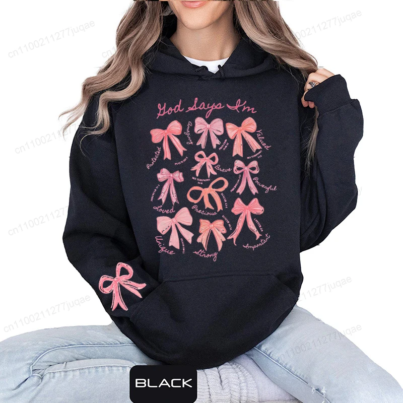Christian Bible Verse Jesus Hoodie Women’s Casual Hooded Sweatshirt Creative Hoodie Streetwear God Says I Am Coquette Bow Hoodie