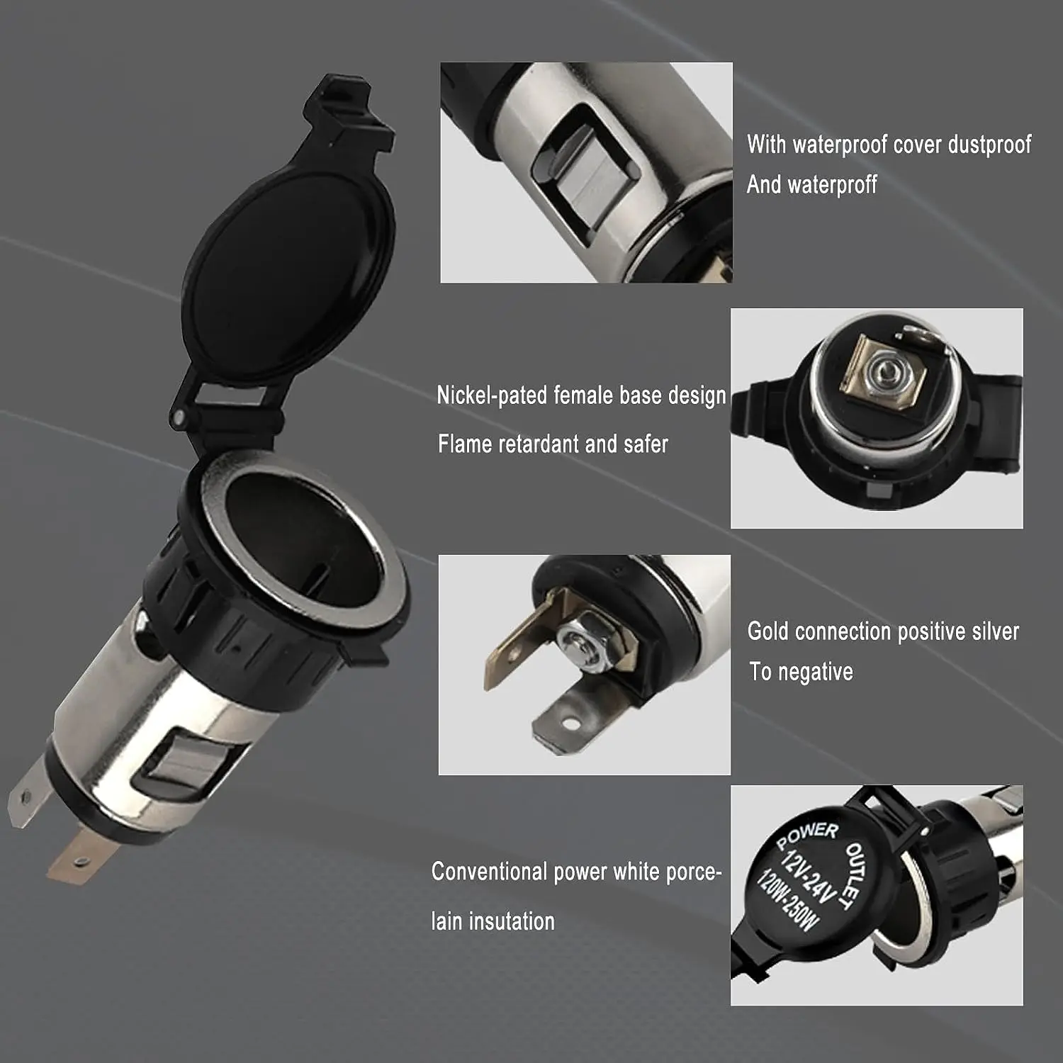 MATERIAL: The cigarette lighter socket made of corrosion resistant materials to ensure solid contact and low voltage drop.It has watertight cap to keep aways from the water and dust.Rating,This female car cigarette lighter rated 12V 10A,120W.