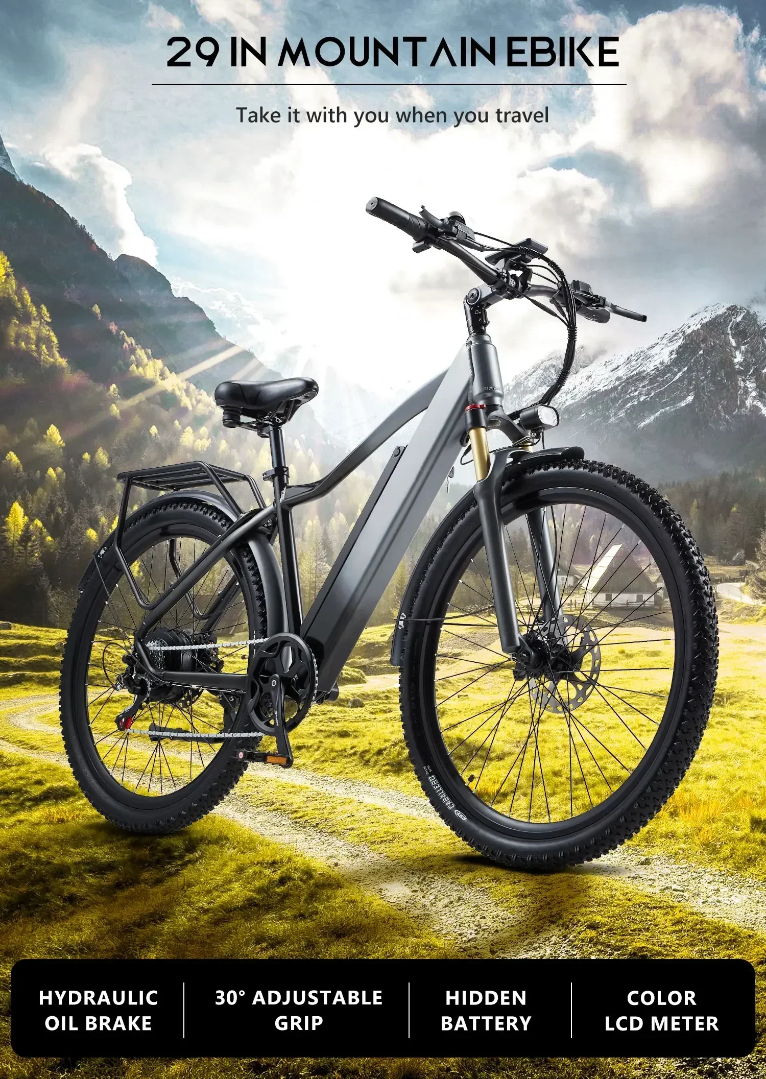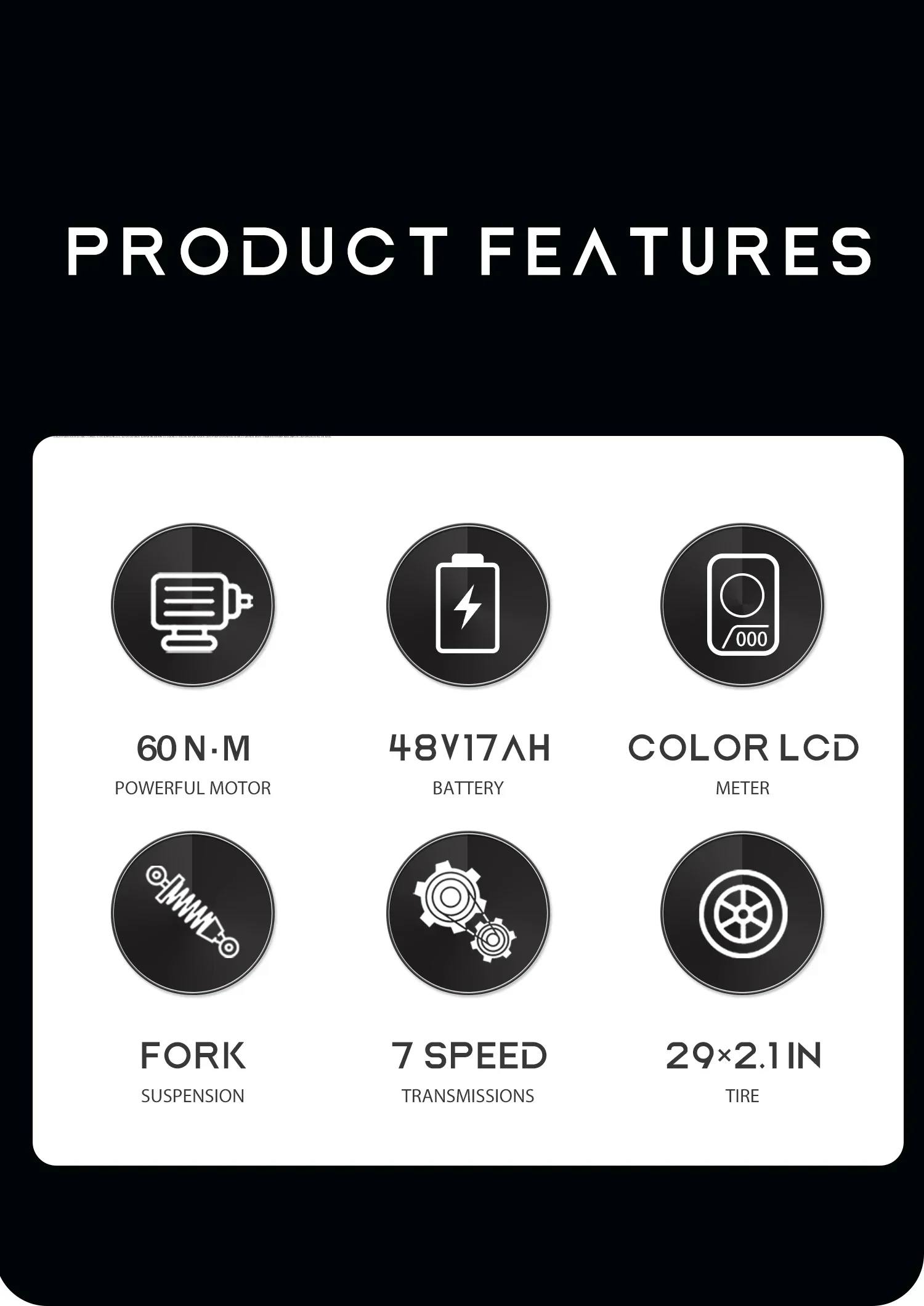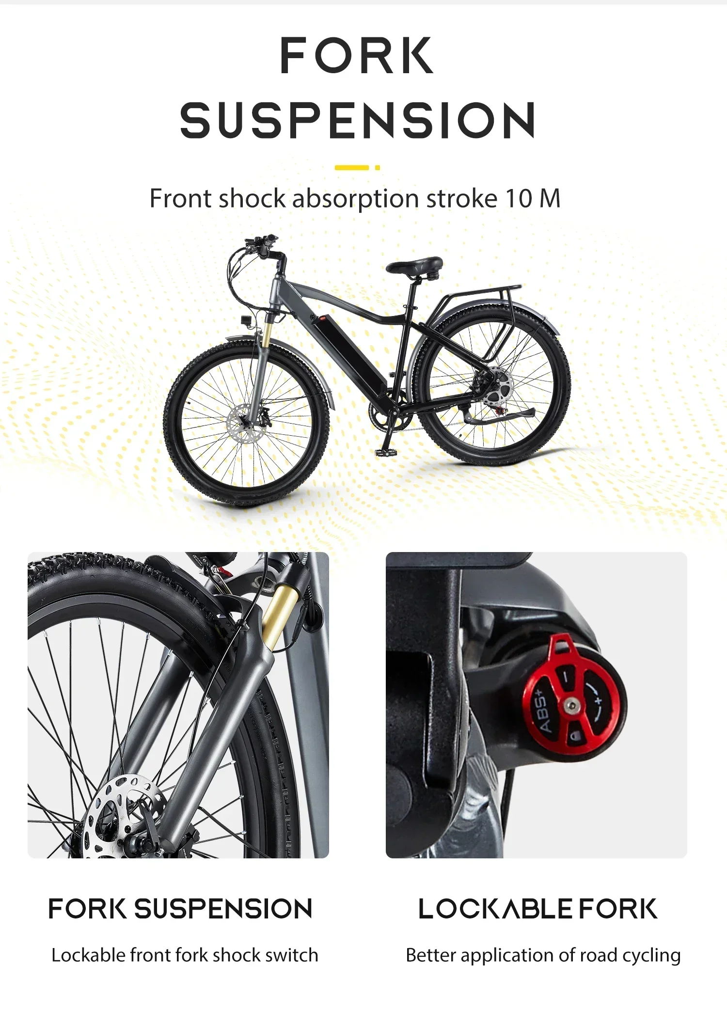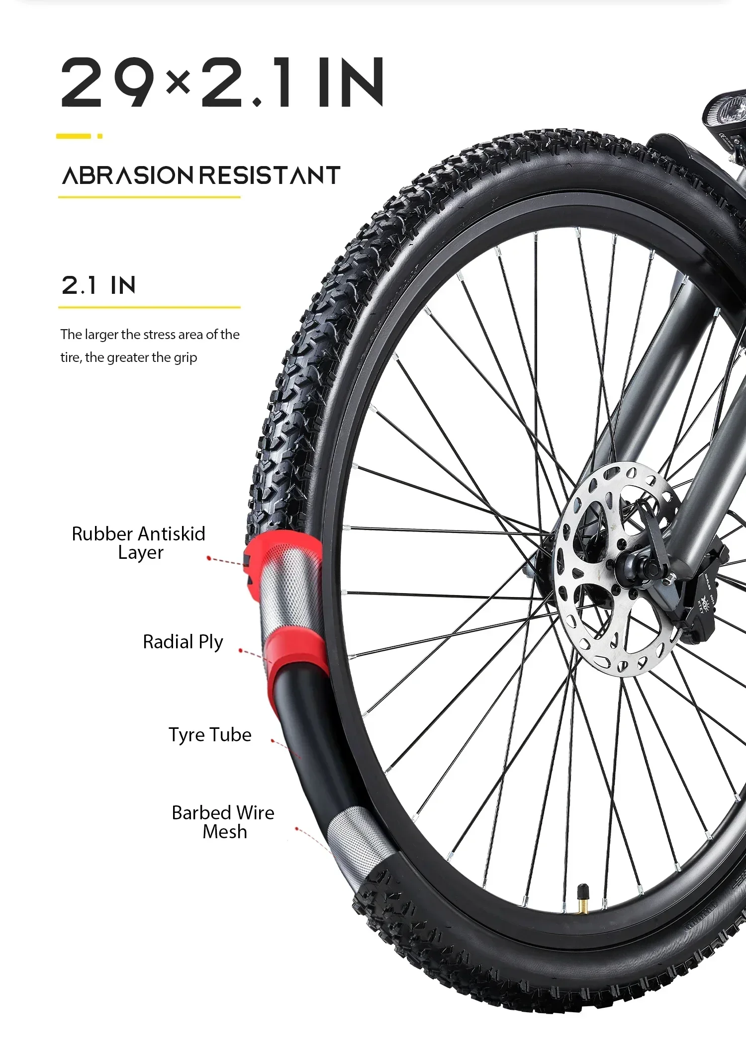 This E-bike is equipped with an adjustable front fork and 29×2.1 mountain tires.