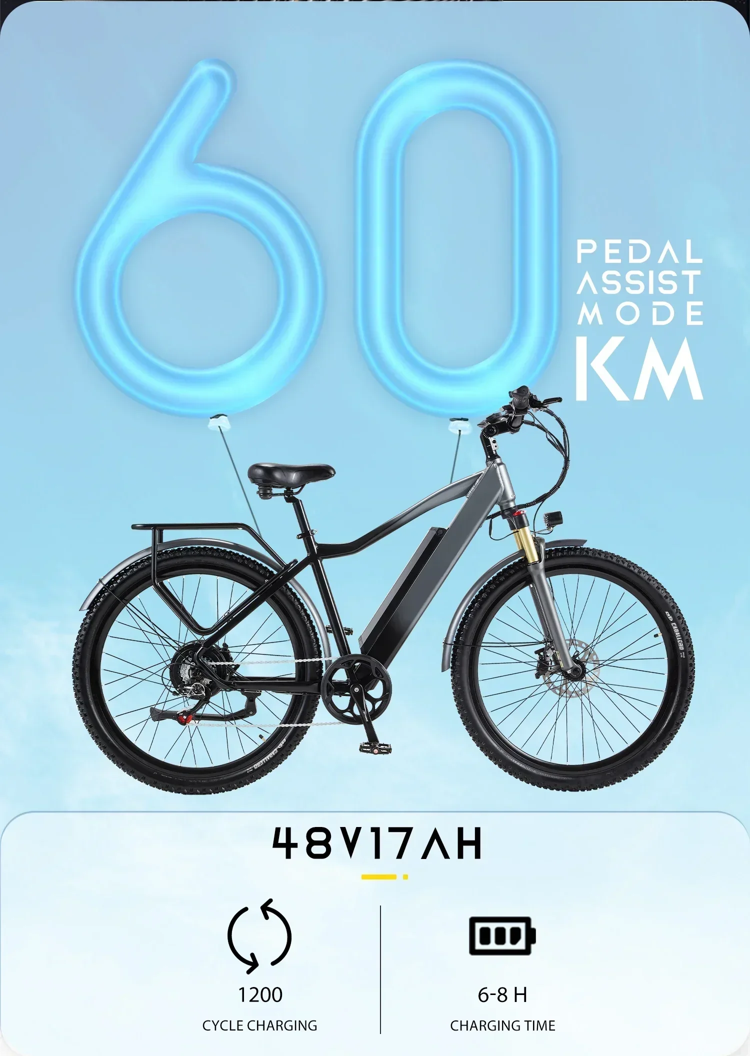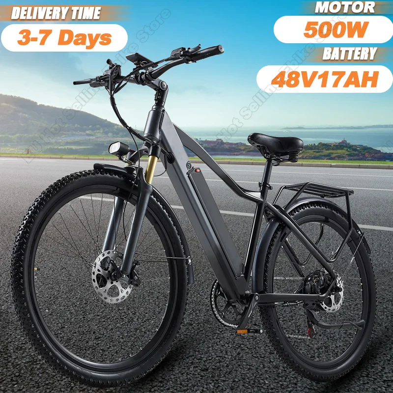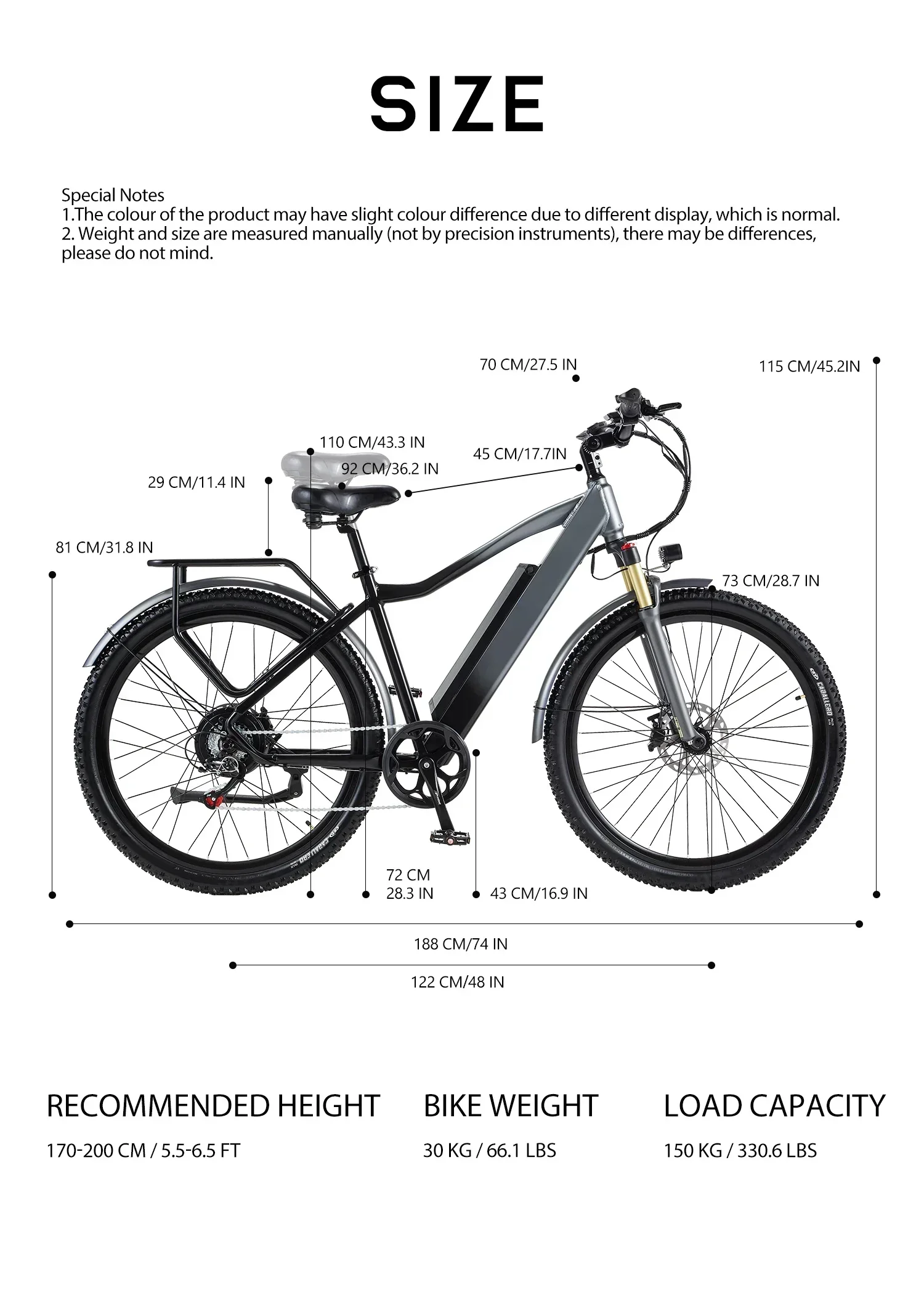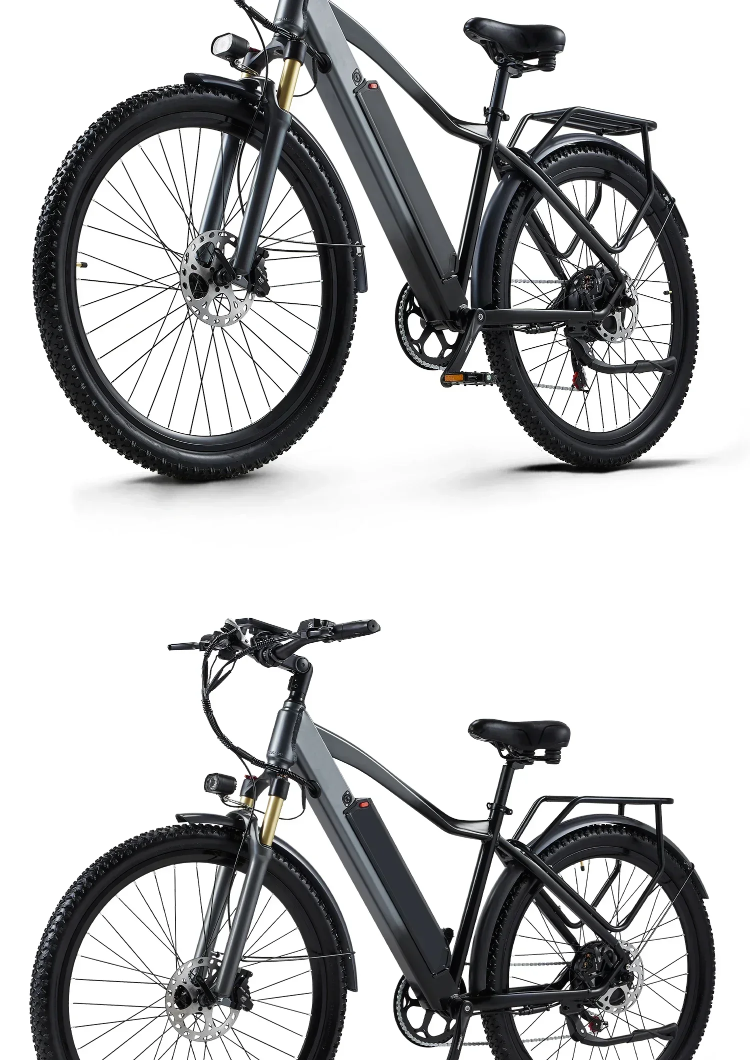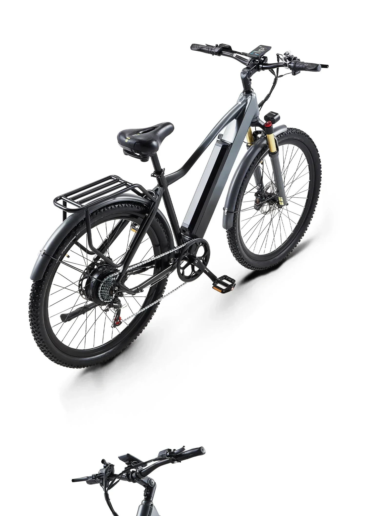 This E-bike is equipped with an adjustable front fork and 29×2.1 mountain tires.