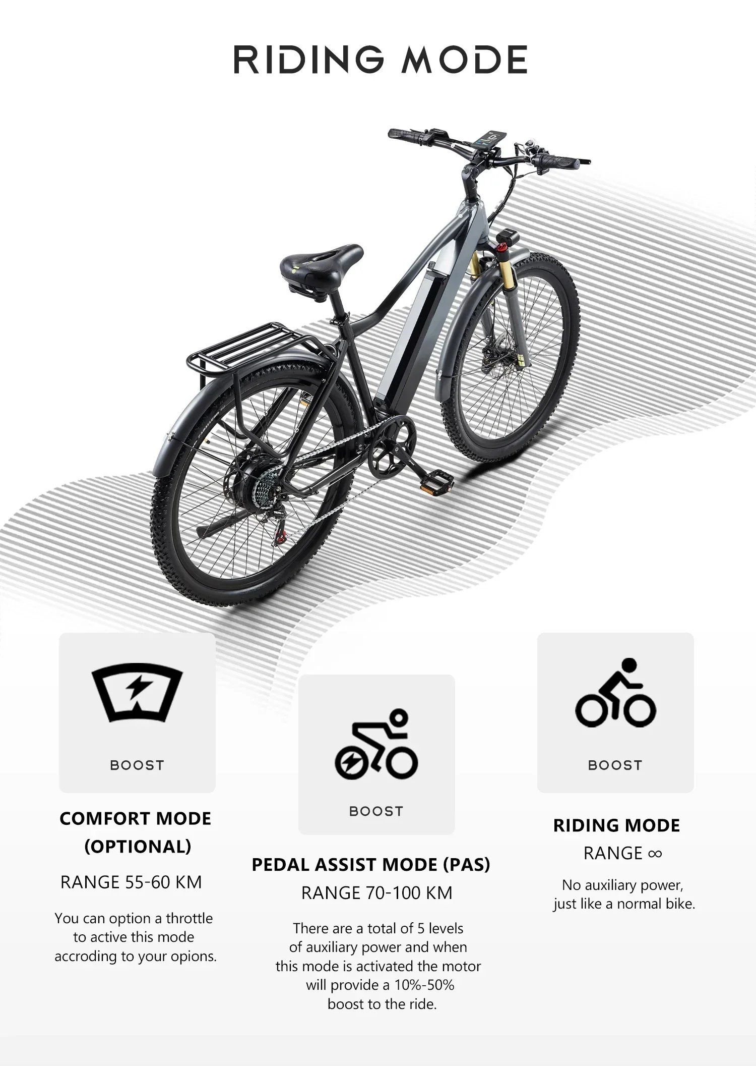 Adult electric bike equipped with disc mechanical brakes, EBS braking system with brake off function, ensures fast and reliable stopping.