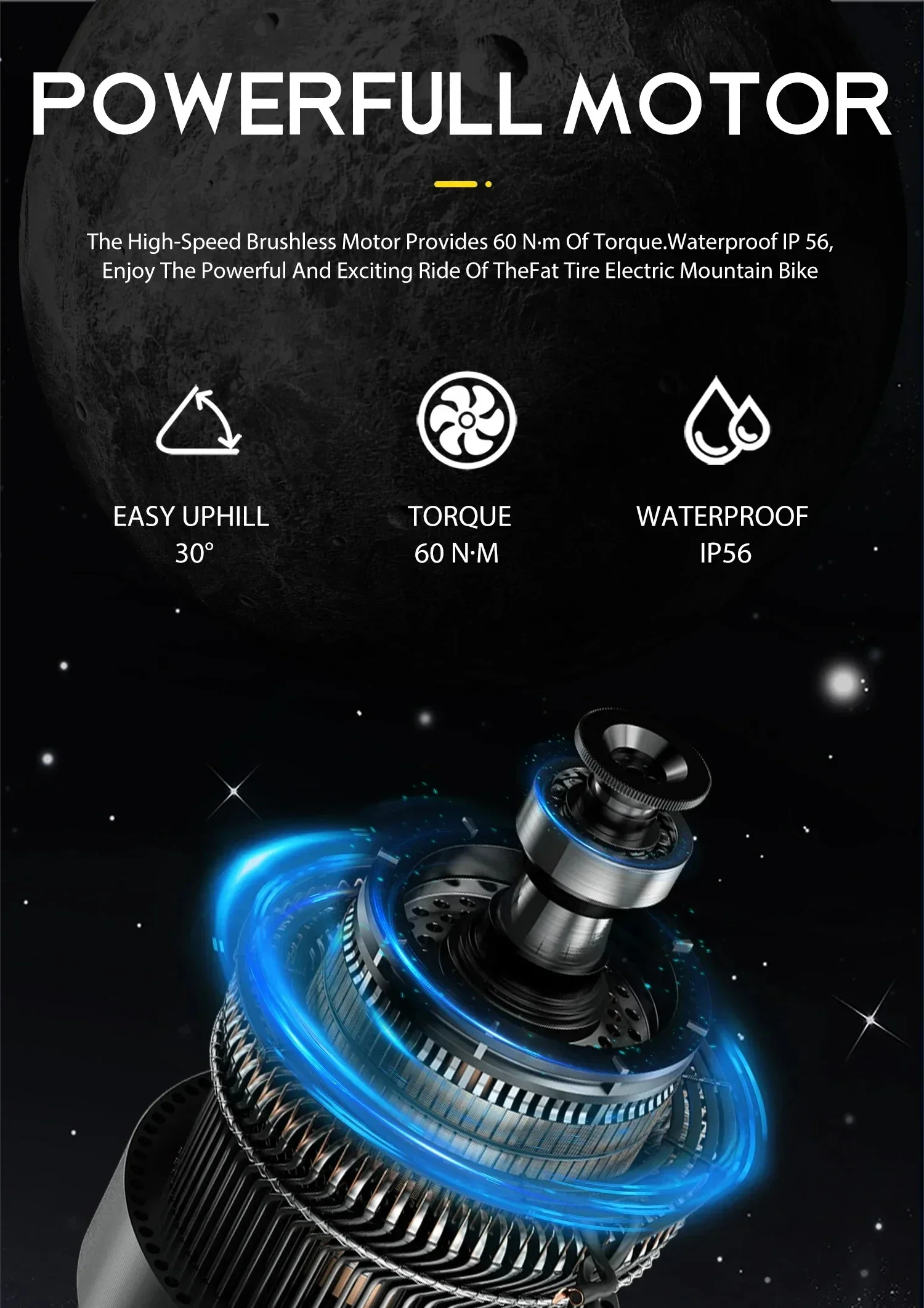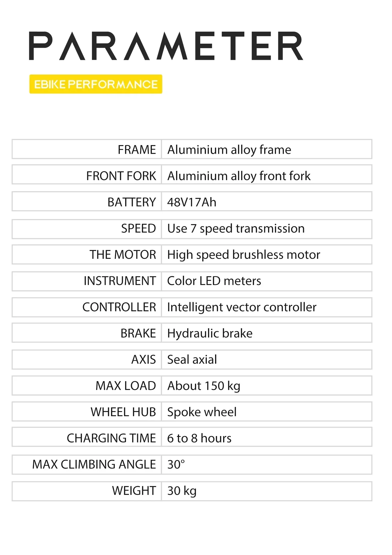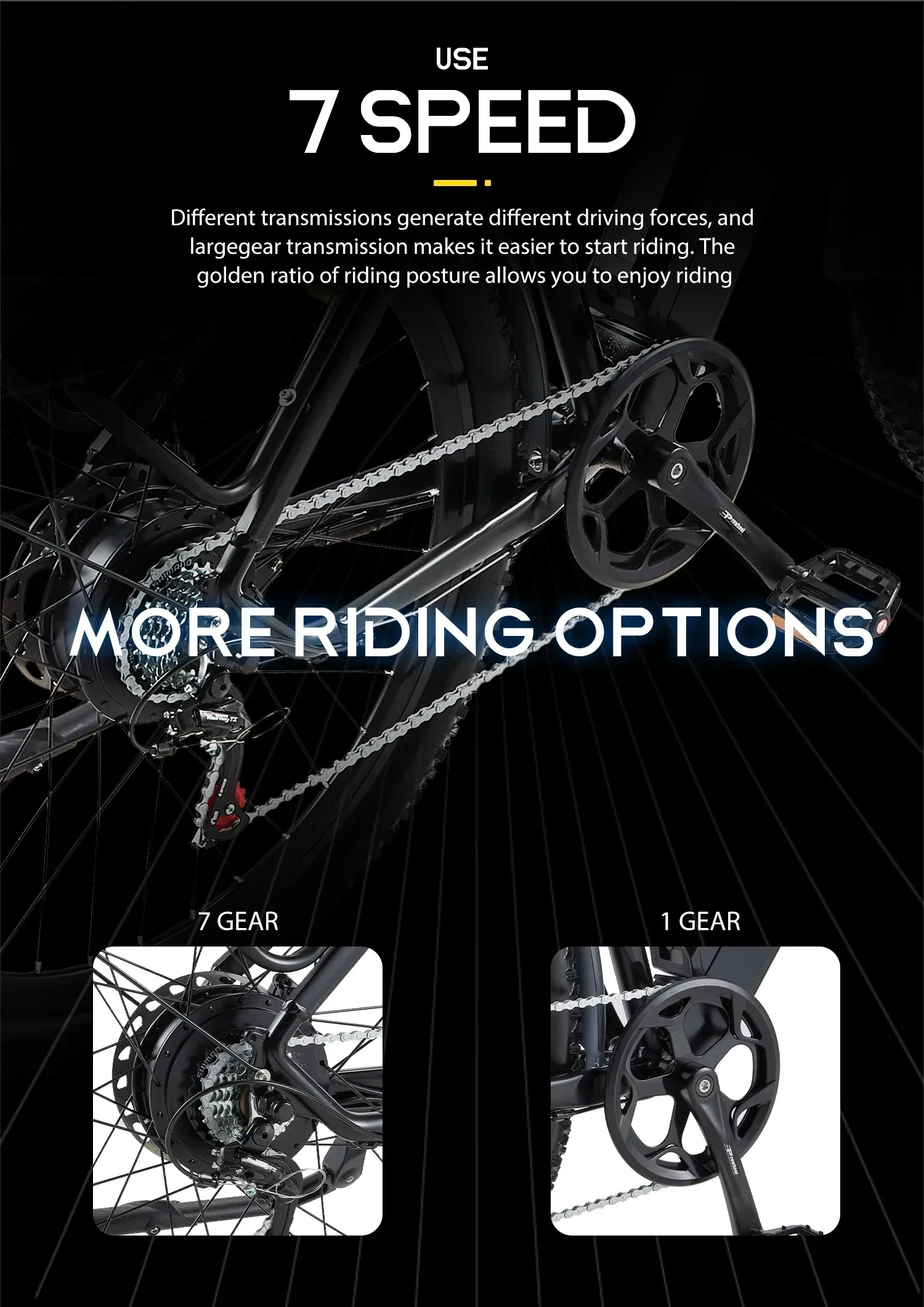 This electric mountainbike is equipped with a high-speed brushless gear motor, which can provide enough power to easily climb a 30° slope, and a 7-speed gearbox, which provides more riding options and stable performance, different gear ratios produce different driving forces, and the professional gear system is designed for various terrains and can easily meet all your speed requirements.