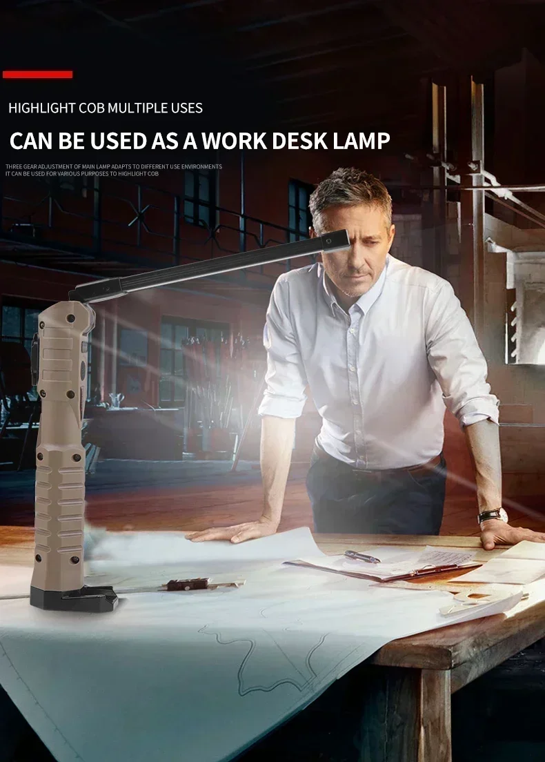 Features: widened work lamp base, with magnets and hidden hooks. Double-sided lamp board design, which can be folded up and down 180°, which is convenient for vertical and handheld use