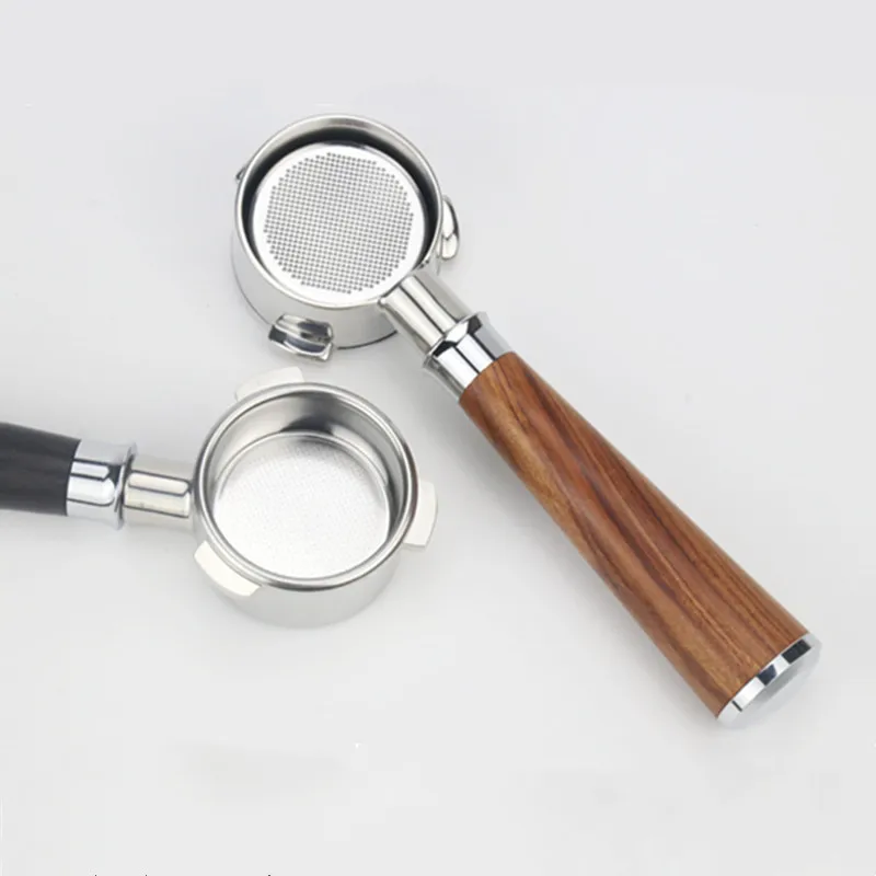 The M10 Coffee Portafilter solid wooden handle, offering a comfortable grip and enhancing the overall user experience.