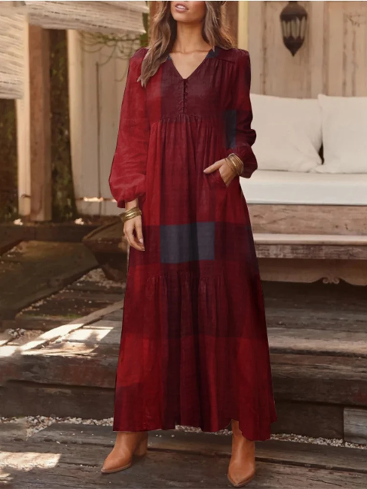Color Blocked V-neck Long Sleeved Printed Casual Women’s Dress Street Fashion Artistic Retro Style Autumn Dresses