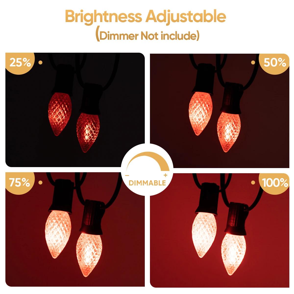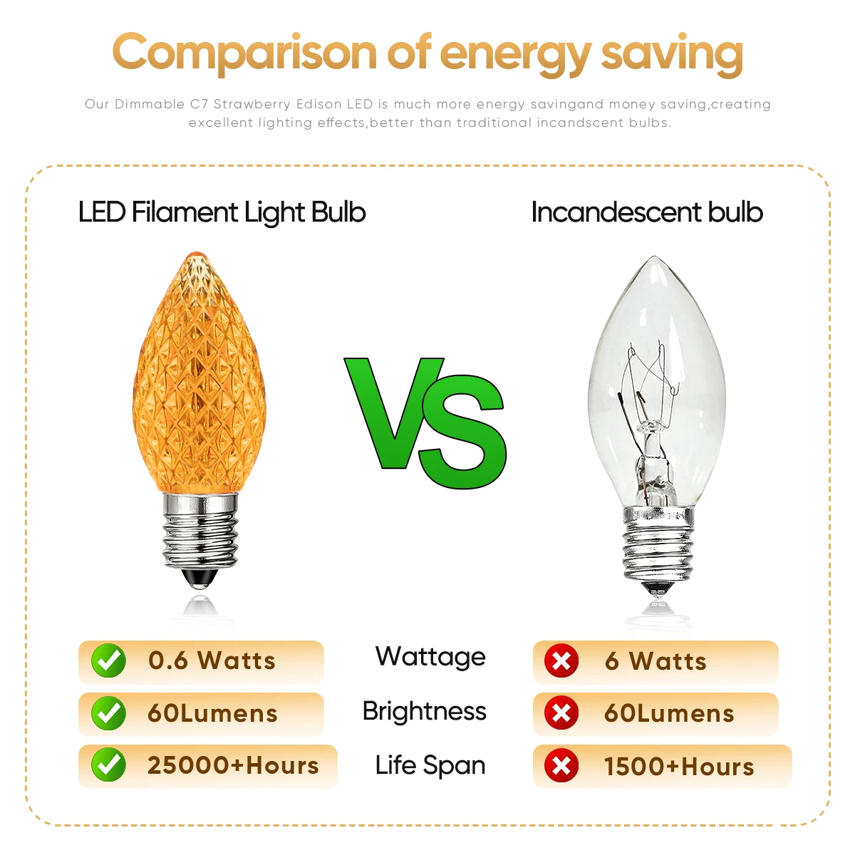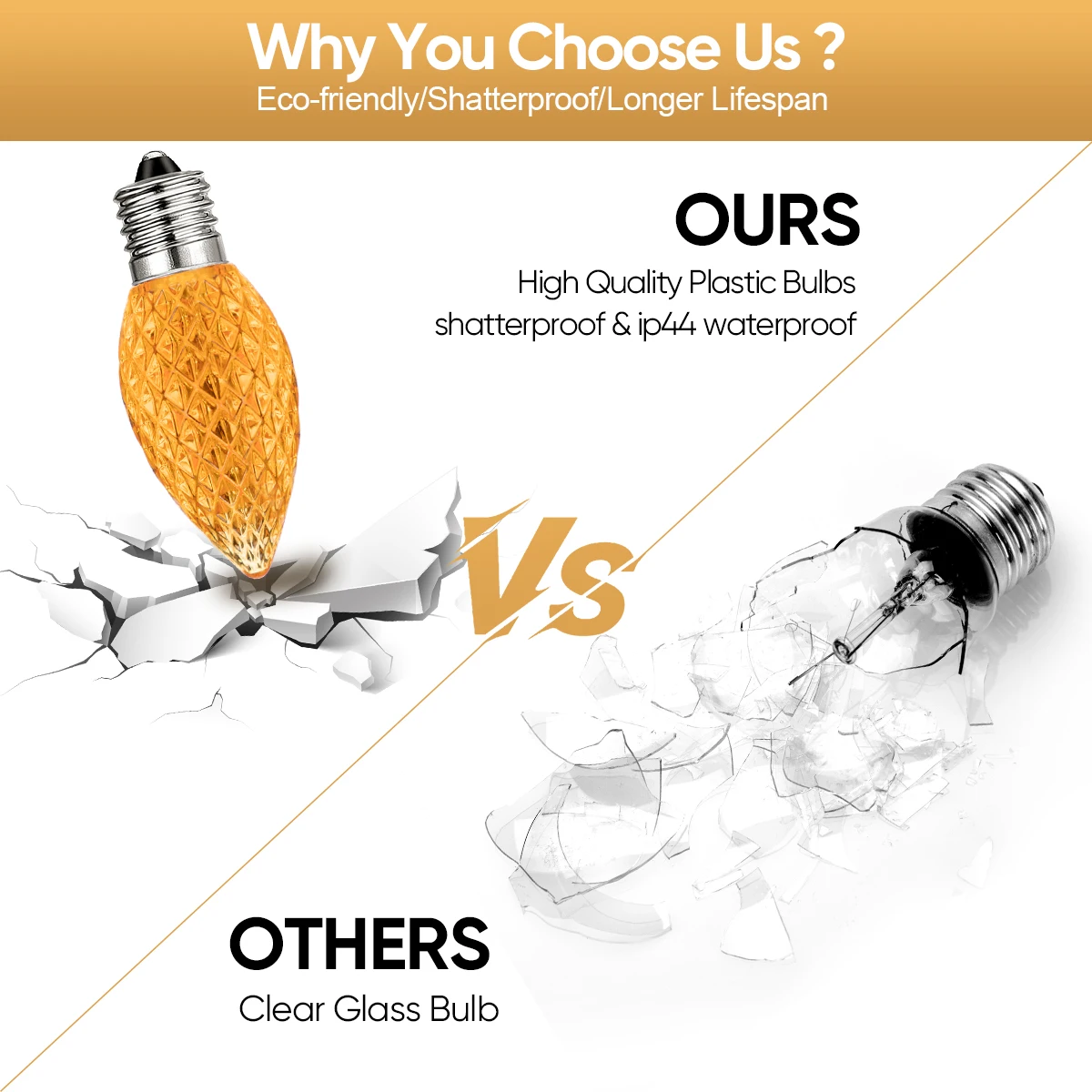 ⛱️Long Lasting & Energy Saving–0.6 W per bulbs. Every C7 bulb is rated for a 2,500 hour life span and will fit into any C7/E12 socket base. We highly recommend purchasing an extra box of bulbs to have on hand to be used for replacements when the time comes.