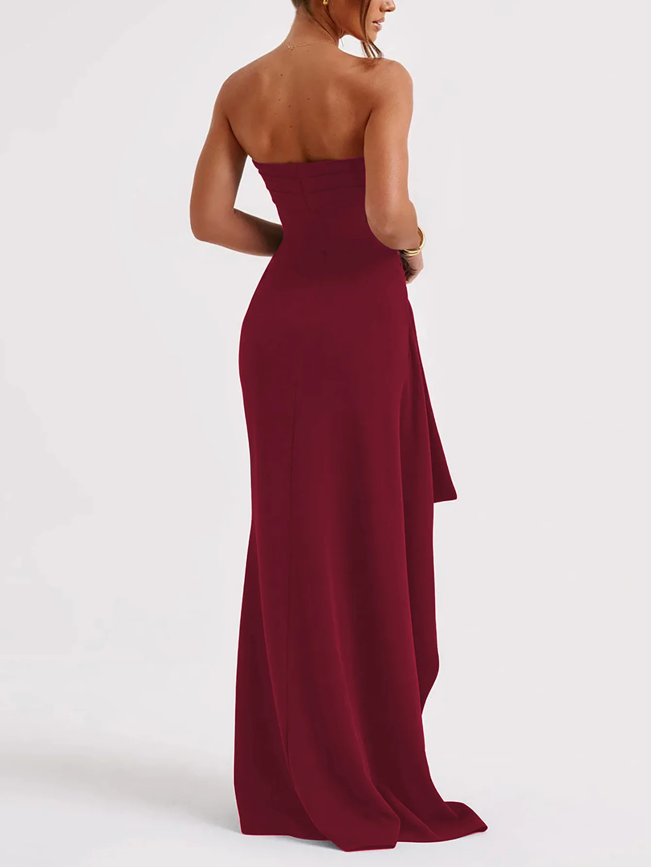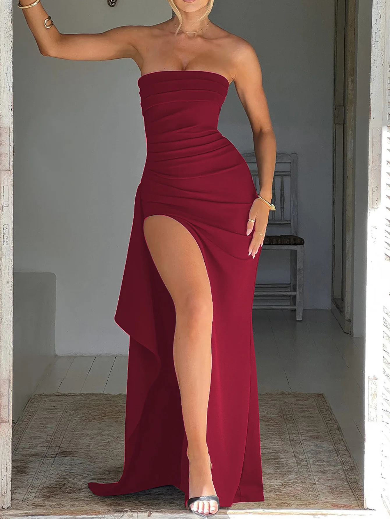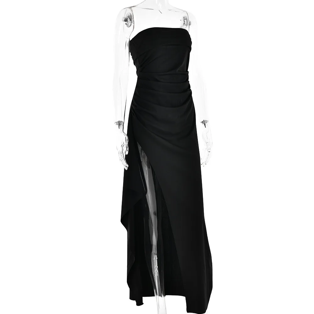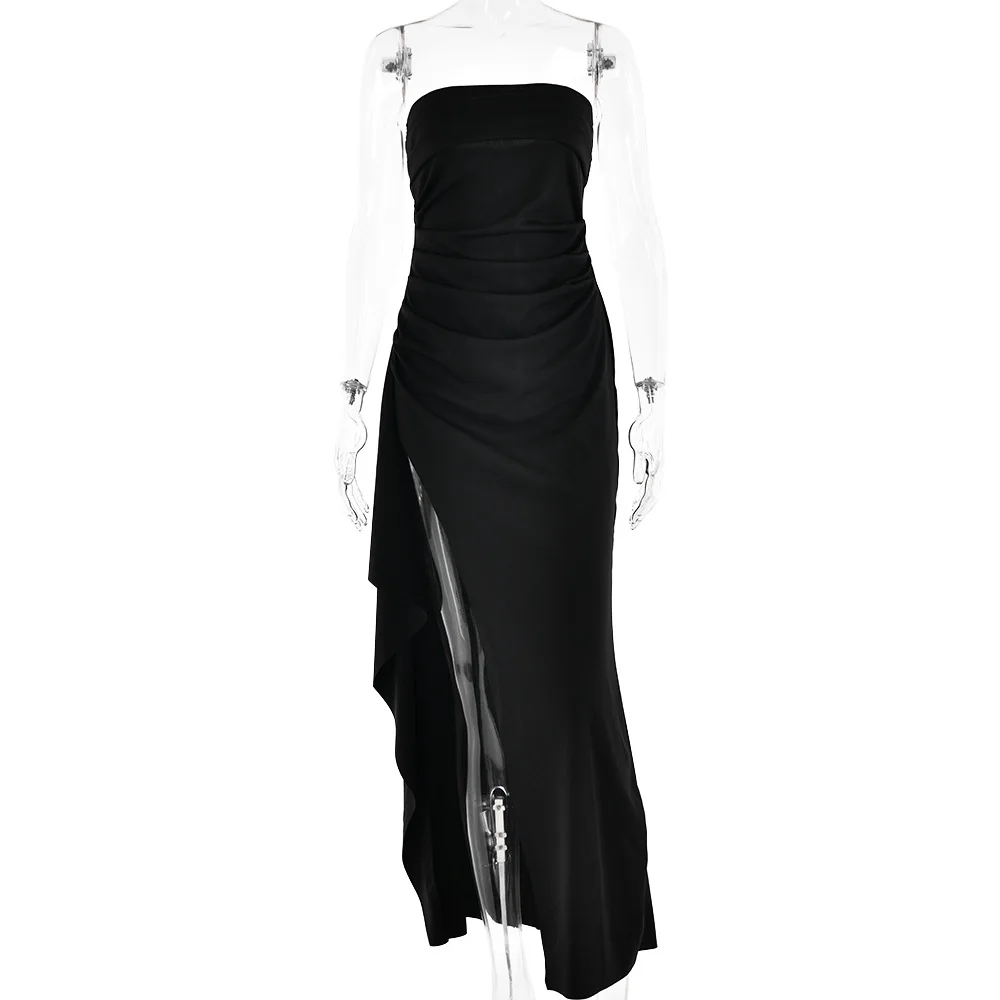 Cryptographic Off Shoulder Elegant High Rise Split Maxi Dress Club Outfits for Women Sexy Strapless Evening Dresses Ruched Gown