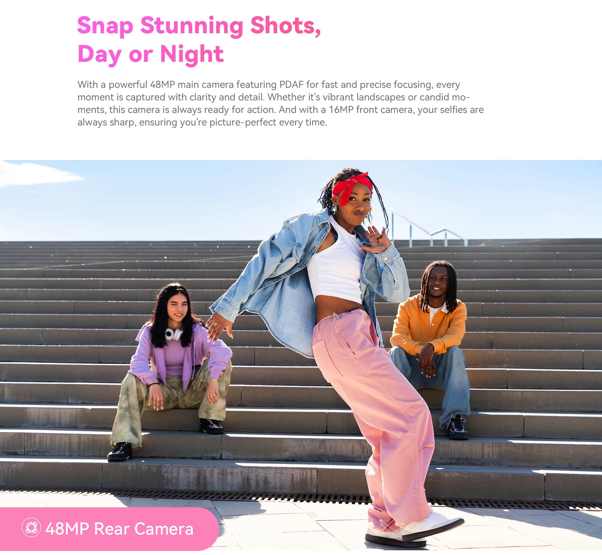 With a powerful 48MP main camera featuring PDAF for fast and precise focusing, every moment is captured with clarity and detail. Whether it’s vibrant landscapes or candid moments, this camera is always ready for action. And with a 16MP front camera, your selfies are always sharp, ensuring you’re picture-perfect every time.