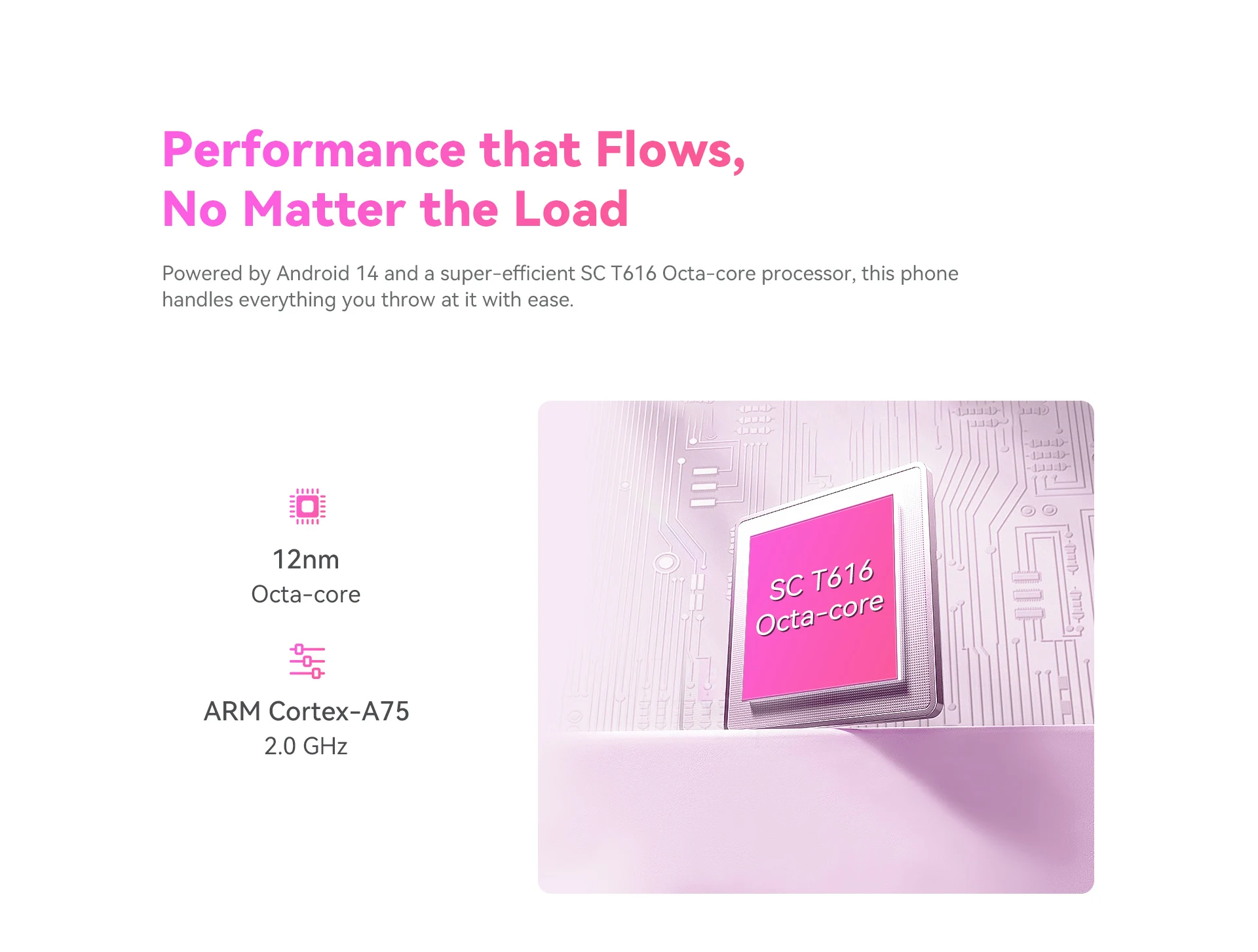 Powered by Android 14 and a super-efficient SC T616 Octa-core processor, this phone handles everything you throw at it with ease.