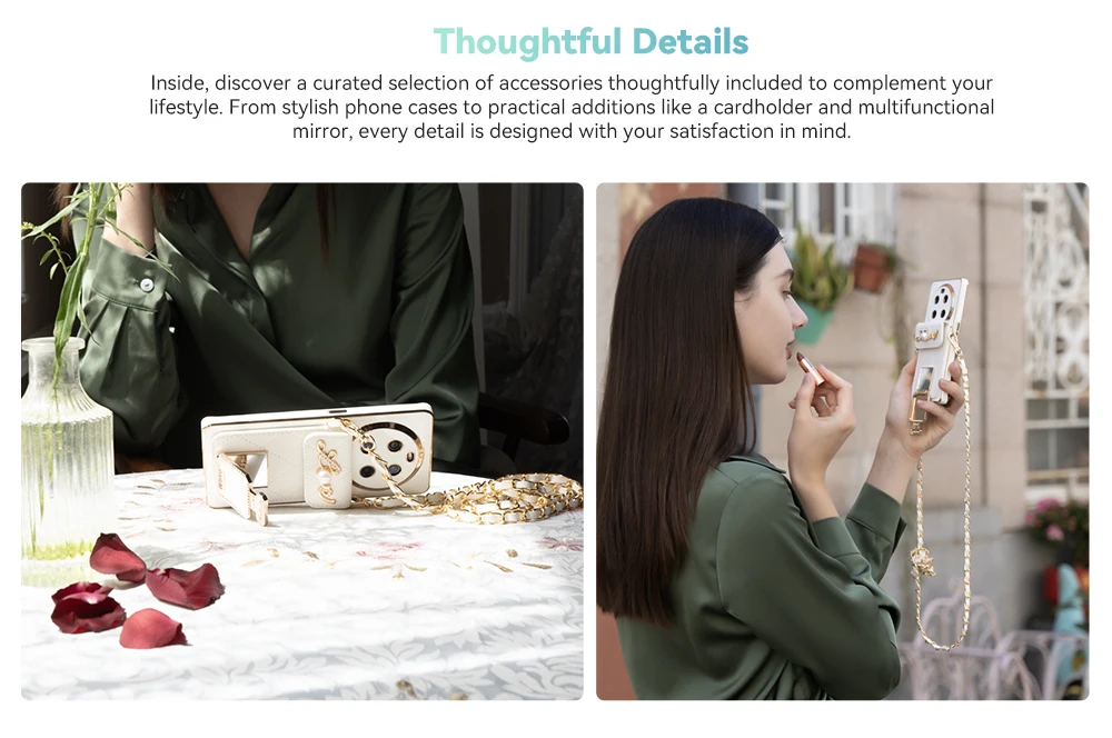 Inside, discover a curated selection of accessories thoughtfully included to complement your lifestyle. From stylish phone cases to practical additions like a cardholder and multifunctional mirror, every detail is designed with your satisfaction in mind.