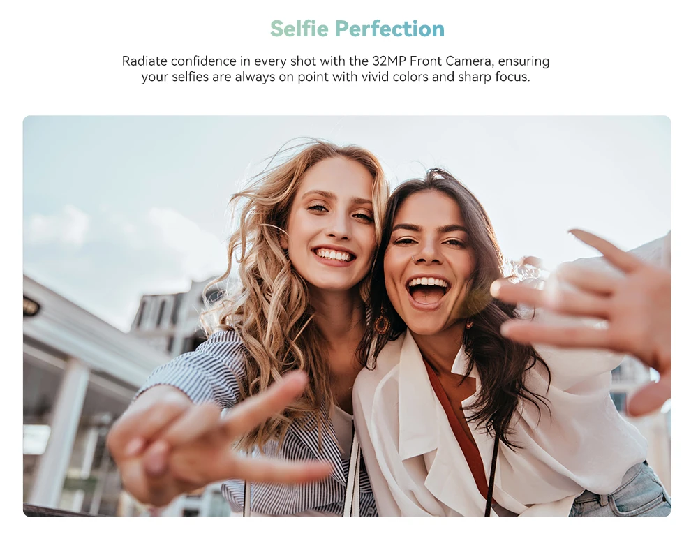 Radiate confidence in every shot with the 32MP Front Camera, ensuring your selfies are always on point with vivid colors and sharp focus.