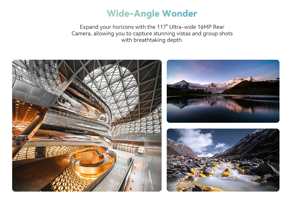 Expand your horizons with the 117° Ultra-wide 16MP Rear Camera, allowing you to capture stunning vistas and group shots with breathtaking depth.