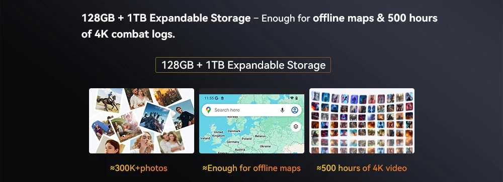 128GB + 1TB Expandable Storage– Enough for offline maps & 500 hours of 4K combat logs.